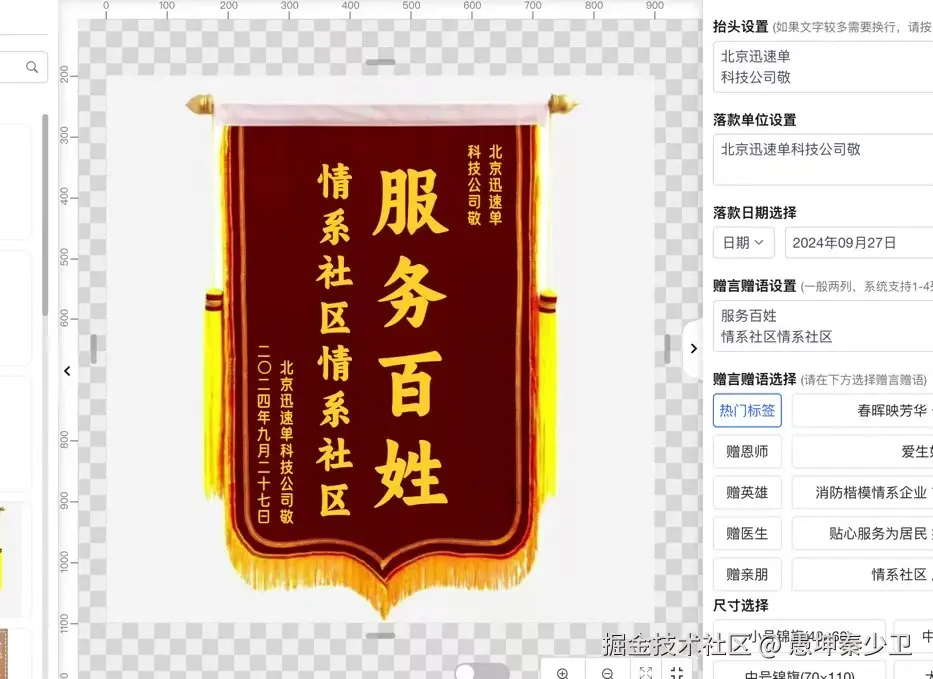 锦旗与铭牌设计则更注重文字内容的自动排版。系统需要根据用户输入的抬头、落款、赠言等内容,自动计算最优的文字间距和整体布局,确保作品的美观性。特别是铭牌设计,还需要实现曲线文字功能,让文字能够优雅地沿着弧形排布。