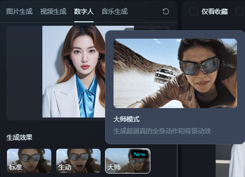 第三步,创作数字人视频 我们进去“数字人”的栏目,点击“对口型”,进入创作。 角色,我们直接用刚才的美女图片; 在生成效果上,我们就选择【大师】,能生成逼真的全身动态视频 然后选择文本朗读,或者上场本地配音。这里我们复制一段文案,也可以用DeepSeek写。朗读的音色,按照你的角色选择。