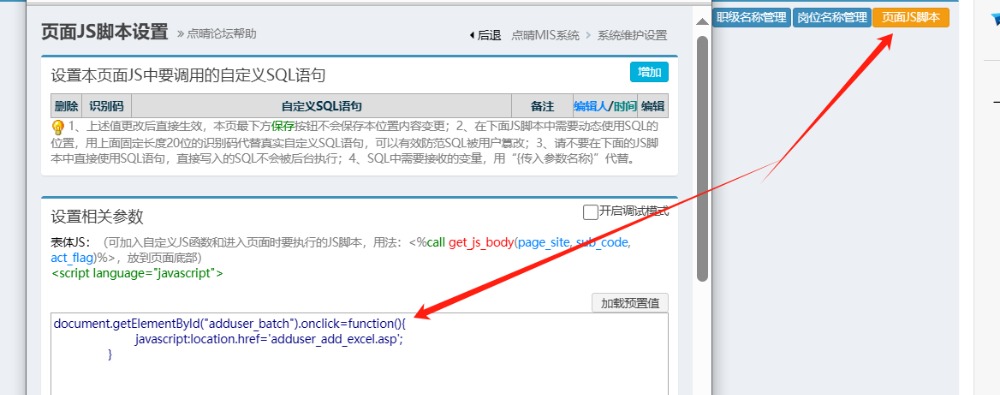 ![]() 在页面的js添加以下代码,再重进才能使用 document.getElementById("adduser_batch").onclick=function(){ javascript:location.href='adduser_add_excel.asp'; } 如下图: ![]() 点晴模切ERP更多信息:http://moqie.clicksun.cn,联系电话:4001861886 该文章在 2025/3/21 14:01:35 编辑过 |