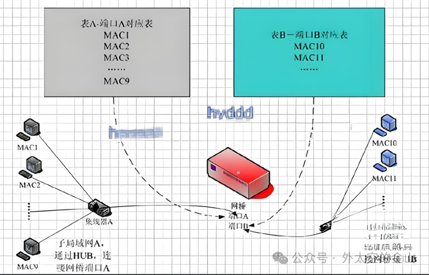 网桥和交换机区别在叙述前,我们先一起看两幅图: 1.网桥的连接模式:(红点处为HUB)