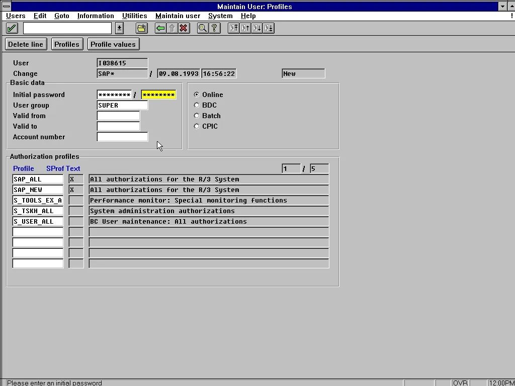 今天看到了一篇文章,上面有不少SAP 30多年前的系统界面,有点感触,所以写了这篇文章。 现在就让我们回到过去,时间点是1994年,可能有些读者还未出生了。 当时SAP的版本是:SAP R/3 2.1D,我们一起看看当时的系统界面,并从界面中看看当时的系统架构和功能。 从下图的登录界面,可以看到30多年前的SAP就支持了多语言,支持了非常经典的多Client的架构。其中多Client的架构,今天的国产软件很少具备这种类似的架构。 ![]() 下图是今天的登录界面,没什么变化 ![]() 从下图的系统菜单,可以看到当时的SAP已经是一个非常完整的ERP,人财物都包含在内,也就是后勤(SD、MM、PP)、财务、HR,这三大领域都已经有了,并且在财务领域,已经有了FI模块、CO模块(管理会计)、资金模块以及合并报表模块了,PS模块也有了。 ![]() 从下图创建用户和分配权限的界面,可以看出来,
