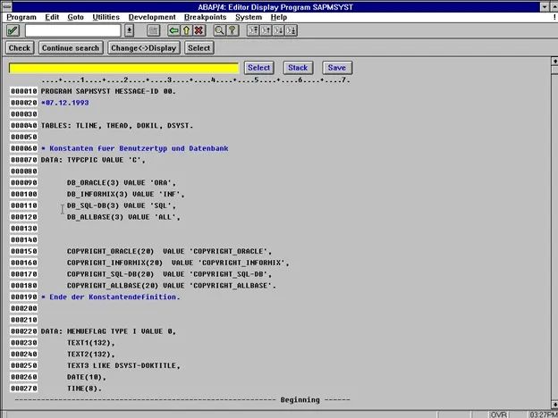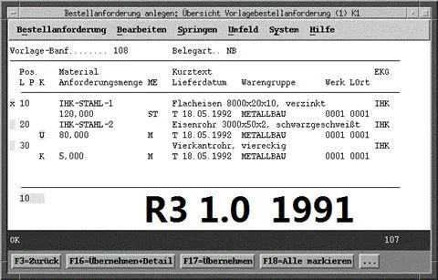 ![]() 下图是今天的维护用户和权限的系统界面,可以看出来今天的用户模型和权限管理只是在R3的基础上不停迭代增强 ![]() 下图是事务代码BD02查看系统和数据库情况,这幅图中比较有意思的是当时的SAP中只有1488多张表,有点出乎我的意料。![]() 今天的S/4功能已经强大很多了,已经有15万个表了,是当时的100倍了,同时我相信R3的1488个表,基本都是被继承下来了。 ![]() 此时SAP的自己的语言:ABAP已经面世了。 ABAP一方面是SAP内部开发的语言,另外一方面也是给客户用的自开发语言。 我们看到每一行的代码都觉得亲切,可以读懂当时的代码,甚至今天的ABAP还是兼容这些语法的。 ![]() 上图的程序名甚至在今天的SAP中都存在,只是上图示例的程序比较特别,本身是SAP内核的程序,所以不允许我们去查看和修改了。 ![]() 下图为创建销售订单的界面,可以看到30多年的SAP就有了非常经典的定价模型(Pricing)、计划行模型(schedule lines)、合作伙伴模型(Partner)。 ![]() 下面这幅图是现在创建销售订单的界面 ![]() 这幅图(下图)是R3的第一版(1.0)的操作界面,尽管该界面甚至都不是window的界面,语言也是德文的,但今天做SAP的人一眼就能读懂30多年前的系统界面的信息,具体来说这副图记录着一张采购订单的信息,其中采购订单类型是NB,该采购订单有三行(10、20、30),其中第三行的采购类型是供应商寄售(K)、工厂为0001,库存地点是0001,交货日期为1992年5月18日。 为什么能够读懂,是因为这些“语言”,今天仍然在继续使用。 ![]() 今天的采购订单界面 ![]() 30多年前的很多东西已经被淘汰,成为被人遗忘的历史了,但今天的SAP还是活的好好的。 这是因为SAP确实是经典,SAP经典就经典在一开始的架构就非常的不错,然后SAP在这个架构的基础上在不停的迭代,一直在滚雪球,产品BUG越来越少,功能越来越丰富。 SAP的客户可以一直跟着SAP的版本一直升级,从30多年前的R3,到20年前ECC,再到今天的S/4,并且这种升级是可以带着历史的数据,带着自己公司对系统的配置和程序的修改的,这一点是很不容易做到的。相当于换房子的时候,连着家里的家具和装修一起迁移了,省掉了二次装修。 SAP顾问在这个过程中也可以不停的成长、迭代自己,同时特别重要的一点是过去学习到的大部分只是都仍然是有用的,不是刚学到的又很快被SAP抛弃的东西。 人生很重要的一点是做一个可以滚雪球的行业,这样自己的过往是有用的,同时自己也在不停的进步。 SAP不是时髦,不够好看,但确实是经典中经典,有幸从事这一行业,深感幸运。 备注;文章来源: https://community.sap.com/t5/enterprise-resource-planning-blogs-by-sap/installing-sap-r-3-2-1d/ba-p/13554248 该文章在 2025/3/27 12:31:46 编辑过 |
