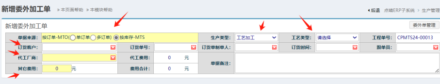 首先选择表头的信息,选择订单来源类型,生产类型,工艺类型,客户,代工商等 如下图: