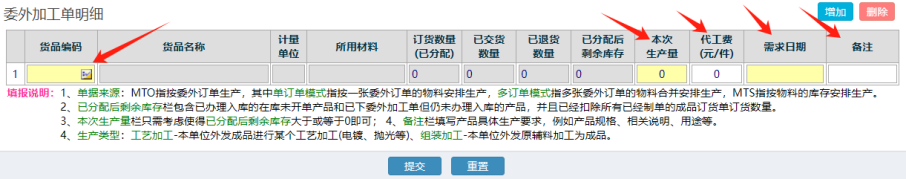 接着选择要加工的物料,然后填上数量,每件的代工费,需求日期,备注等 如下图: ![]()