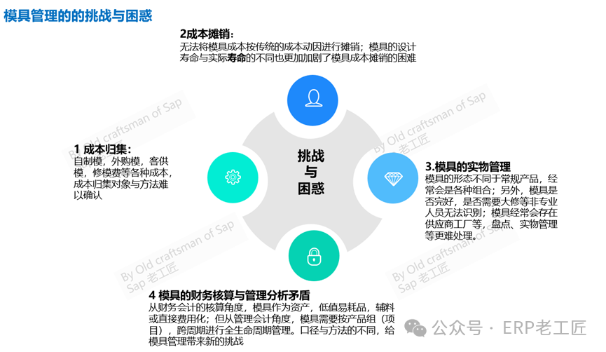 综上,由于模具不同于物料,也不同于资产,在不同的行业中,模具的成本占比大小不同,因此,模具管理是项目方案设计的难点之一,大概可以总结为以下几点:1.模具成本归集困难:自制模,外购模,客供模,修模费等各种成本,由于不是公司的主流生产,用哪种方式来归集成本是个难题,尤其是在多系统集成本数字化公司;2.模具成本摊销方法困难:模具是生产产品组件的成本组成,而一般的成本核算是以成品或半成品为成本对象,这就天然的造成了模具成本摊销的困难---无法将模具成本按传统的成本动因(Cost Driver)进行摊销;同时,模具的设计寿命与实际寿命的不同---这是模具的常态,也更加加剧了模具成本摊销的困难。3.模具的实物管理困难:模具的形态不同于常规产品,经常会是各种组合;另外,模具是否完好,是否需要大修等非专业人员无法识别;模具经常会存在供应商工厂等,盘点、实物管理等更难处理;从财务会计的核算角度,模具作为资产,低值易耗品,辅料或直接费用化;但从管理会计角度,模具需要按产品组(项目),跨周期进行全生命周期管理。口径与方法的不同,给模具管理带来新的挑战!复杂的场景,成本归集与摊销,实物管理的种种困惑,告诉我们设计流程与方案时必须面对的事实,事实上,我们没有办法设计统一的方案满足各种场景---无论技术多么先进完美,面对这类复杂的业务场景时,首先应该从管理入手,从管理视角,梳理一下管理的思路—特别是面对这种场景与需求时,必须改变的或提升的观念,然后再考虑技术实现手段。这是我解决这类复杂需求的常用方法。在库存与成本管理中,实物流与价值流的背离其实一直存在:比如提完折旧的固定资产,费用化的办公用品等,所以从这个意义上来讲,只要不对损益产生较大影响,会计制度也是认可这种处理方式的。当然,具体到模具管理这块,实物流与价值流背离的情形更加典型,所以就会出现模具按资产管理+无价值物料管理(实物)的组合方案。管理会计中的本量利分析模型告诉我们:成本区分为变动成本与固定成本,模具成本到底是属于固定成本还是变动成本?这是一个很难回答的问题,模具的价值相差太大了,不同行业的区别也很大,所以要从管理视角看待这个问题,必须根据实际的行业及模具类型进行实事求是的分析,不可能有统一的方法。成本核算(FI核算)与成本分析(CO管报)与的相对分离:所谓成本核算,侧重于财务会计,即将所有的成本按一定的标准,分摊到成本对象,库存,最终形成损益过程,强调合规,从系统设计上,以业财务一体为主,对数据、流程及方案有较高的要求,因此,当企业的基础条件达不到,管理基础较弱时,我们可以在核算层级稍微粗略,以达到会计核算要求为准。而成本分析以内部管理考核为准,按照“数据同源”的原则,数据来源应该与成本核算同维度,同口径。但是,在一些特殊业务场景或分析需求时,二者是有可能背离的,项目实践告诉我们,这种背离是可接受的! 成本分析需求在事后通过开发报表或其他技术工具方式实现。这样做,最大好处理对数据流程的依赖性有所降低,同时也基本满足了成本核算与成本分析的需求。这就是所谓的成本核算与成本分析的相对分离的概念。在考虑模具处理方案时,也有必要参考这种管理理念,问题就会变得好理解一些。甚于于以上痛点及解决思路,初步小结以下7种解决方案:方案1按固定资产管理:按套模具建立资产卡片,在资产使用期内,按月摊销折旧成本,这种情况下,折旧成本一般作为“公共”的费用,平均摊销给该产线的所有产品,一般是按机器工时分摊。这种方式,一般适用于金额较大的压铸模,注塑模等。从“成本分析”来看,这种方式,有明显的管理缺陷,模具的成本没有摊销到正确的成本对象上,摊销金额也经常背离模具的使用周期。方案2按库存物料管理+领用直接费用化:模具在入库时,作为库存物料,领用时,一次性作为费用消耗处理。这种方式仅适用于单价较小,数量众多的塑胶玻璃木质模具,这类模具大多类似于工装夹治具。事实上,为了准确分摊成本,在项目中,可能有各种变通的开发方案辅助方案3:以模具理论产出量作为库存数量,模具物料作为BOM组件,按实际的生产消耗量推算模具用量并减少库存量。优点:将模具成本摊销到对应的产品中,成本核算较准确缺点:这类物料的价值与实物料背离较大,账实不符成为常态化,适用于模具用量较大,或者模具可重复使用的情况。比如:某个模具设计理论寿命是10000次,生产产品A时,BOM抬头基本数量为1000,哪么BOM中的用量应该是0.1,按这个用量作为BOM组件,如果该模具的成本为5000元,哪么标准成本时,要分摊5000*0.1的成本,在生产订单入库时,如果该生产订单产量是3000PC,哪么要消耗的该模具数量=3000/1000*0.1=0.3,该生产订单消耗的模具成本=0.3*5000=1500.方案4 以模具理论可使用次数为(虚拟)库存数量,并作为BOM子组件搭入BOM,举例如下:某模具的理论设计使用寿命为10000次,如果采购成本为5000元,哪么在采购入库时,按数量10000入库,单价=5000/10000=0.5(元/模次)在搭建BOM时,如果BOM的抬头基本数量是1000,哪么就消耗模次数量1000,标准成本应该分摊的模具成本=1000*0.5=500。同样,在生产订单入库或发料时,计算用量,如果生产订单的产量为3000,哪么应该计入订单的模具成本为3000*0.5=1500。与上述样例计算结果相同。优缺点与上述方案3类似,只是思路