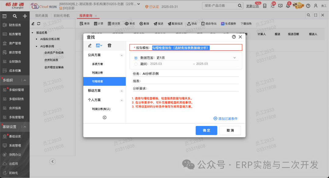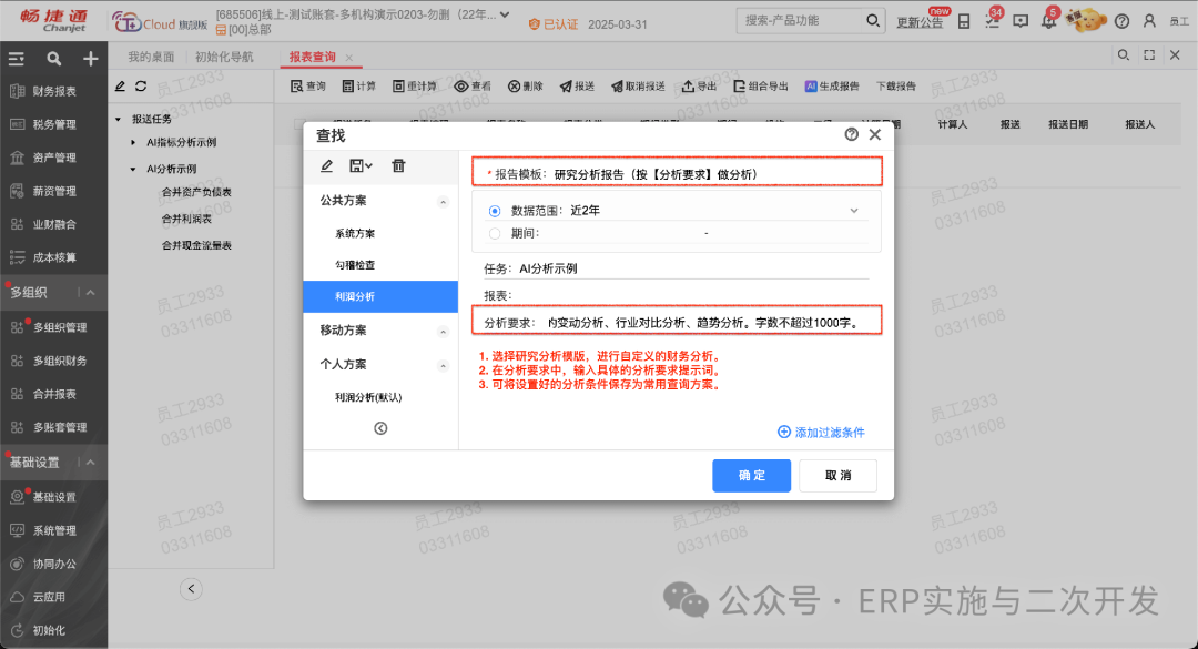 预置多类报告模版,生成所需报告。 推荐用法: 在账套基本信息【所属行业】和【商品分类】中维护正确的主营行业和主营品类,或者在【分析要求】中输入更详细的主营业务等企业基本信息,以便生成更严谨的行业对比与趋势分析等报告内容。 例如,在分析毛利率的行业对比情况时: 输入“本公司的主营业务是汽车配件制造”,可依据较粗的行业参考值15%-25%进行分析。 输入“本公司的主营业务是汽车配件制造(底盘结构件)”,可依据更细的行业参考值18%-25%进行分析。 用法举例: A.计算并分析:选择利润表、资产负债表、现金流量表、部门利润表等报表数据,可进行: