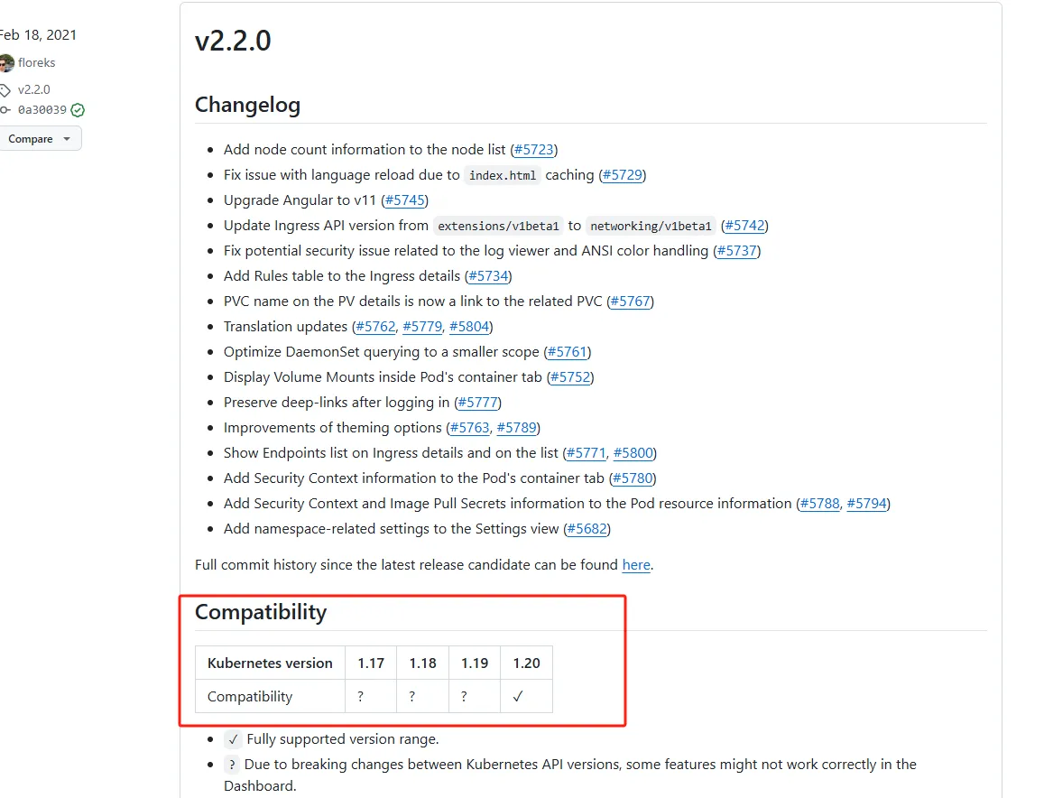 由于本次下载的是1.20.9,所以找到兼容该版本的dashboard进行下载,在Linux中执行以下命令下载上图中的版本。