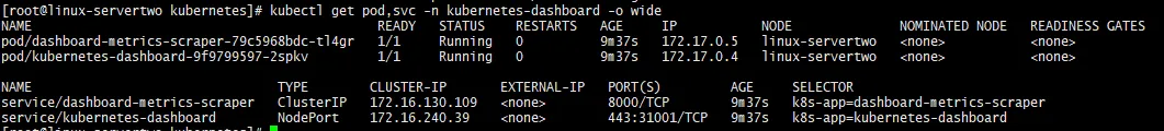 [root@linux-servertwo kubernetes]# kubectl get pod,svc -n kubernetes-dashboard -o wide