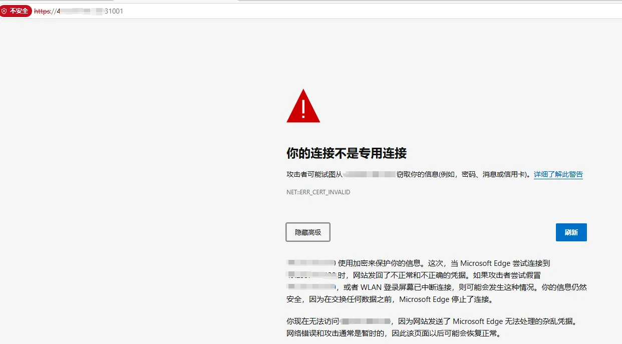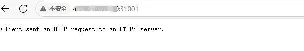 通过访问,浏览器页面报以上错误信息,根据提示加上https:// 进行访问,地址:https://NodeIP:31001 ,再次访问