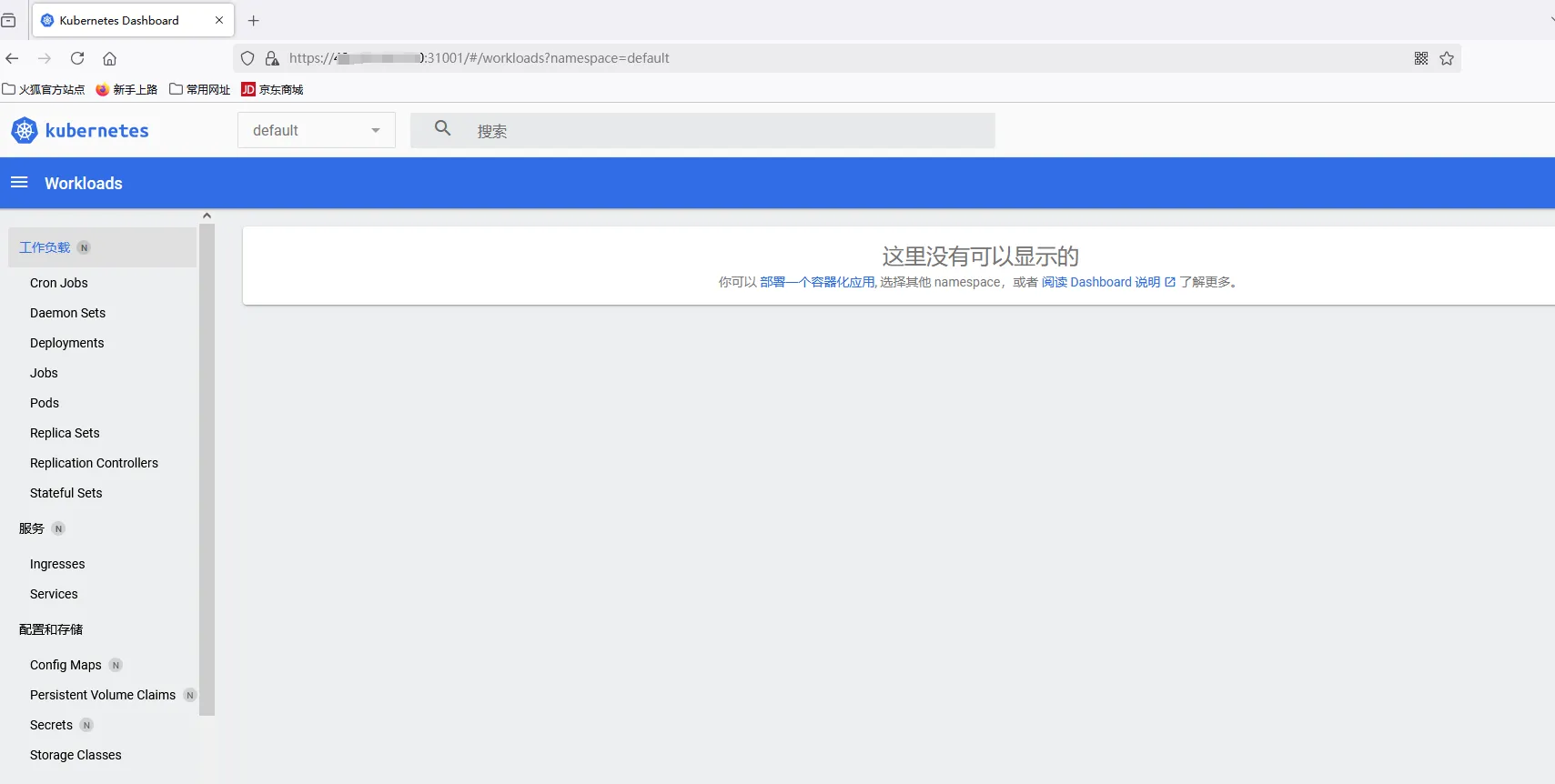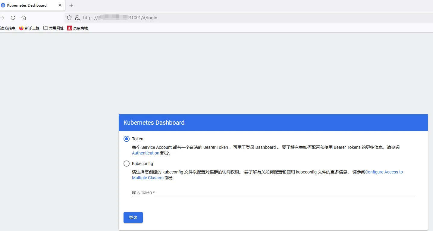 通过以上查看,可以发现kubernetes-dashboard 部署成功了,接下来通过浏览器访问31001端口,查看是否可以访问成功。访问地址:http://NodeIP:31001