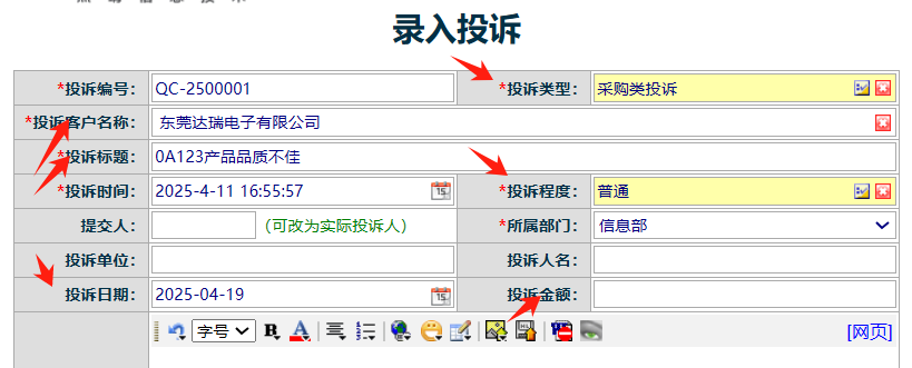 ![]() ![]() 点击进入 如下图: ![]() 首先选择投诉类型,投诉程度,然后填客户各称,标题等带星号的为必填项,按需填写 这两项设置确认人员和查看权限(若不要求,留空即可) 把本次投诉的内容详情,填写上去,最后提交即可 如下图: ![]() 点晴模切ERP更多信息:http://moqie.clicksun.cn,联系电话:4001861886 该文章在 2025/4/11 17:03:16 编辑过 |
