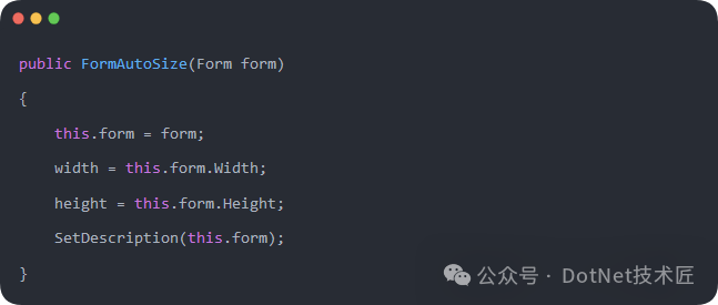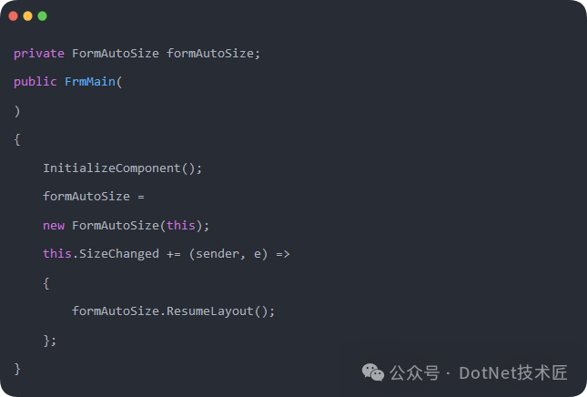 在窗体的构造方法 MainForm() 中实例化 FormAutoSize 对象,并将当前窗体 this 以及初始宽度和高度作为参数传递进去。