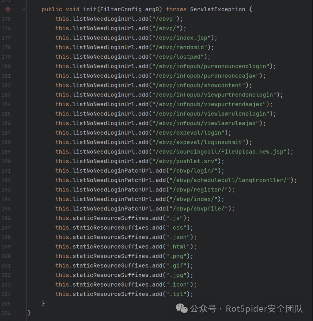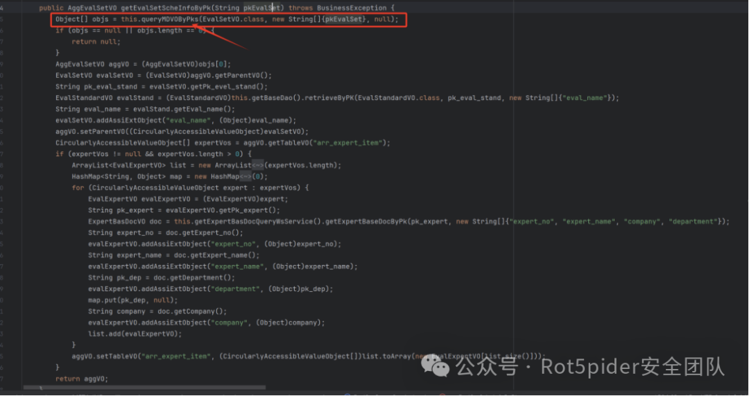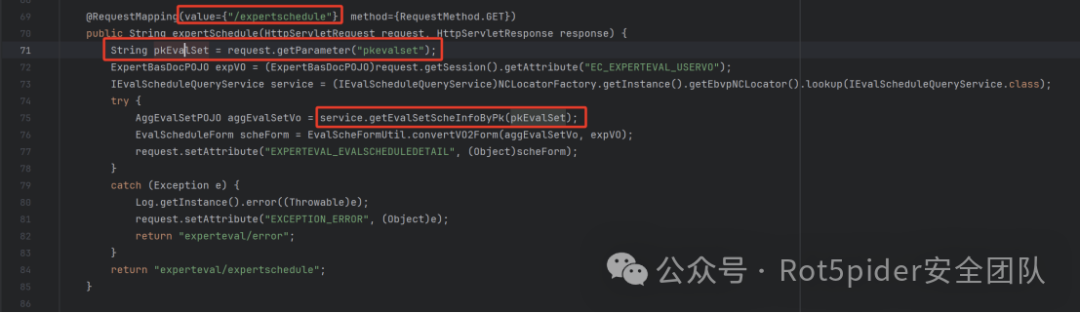 参数在5层方法调用后被拼接入SQL语句. 根据漏洞预警定位到具体路由,简单看下Ebvp业务下的过滤器 EbvpRequestFilter 我们只需要 URL 里有这些后缀或者url 就可以绕过权限校验(懂的都懂) 接下来定位到 EvalScheduleController 控制器下 expertschedule 属性的具体方法先传参“pkevalset”(无限制),调用 service 对象的getEvalSetScheInfoByPk 方法