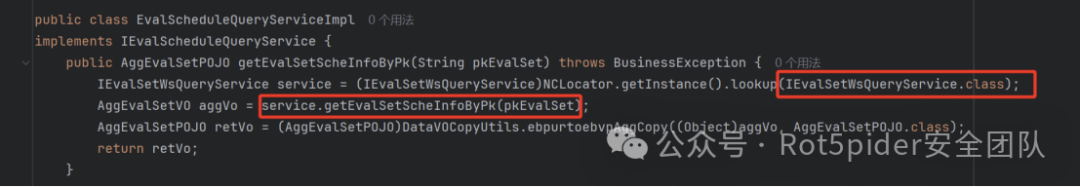 跟进 getEvalSetScheInfoByPk 方法,定位到 EvalScheduleQueryServiceImpl 类 可以看到类方法 getEvalSetScheInfoByPk 调用了 IEvalSetWsQueryService 实例的getEvalSetScheInfoByPk 方法