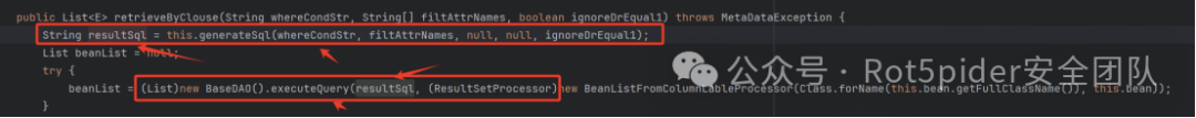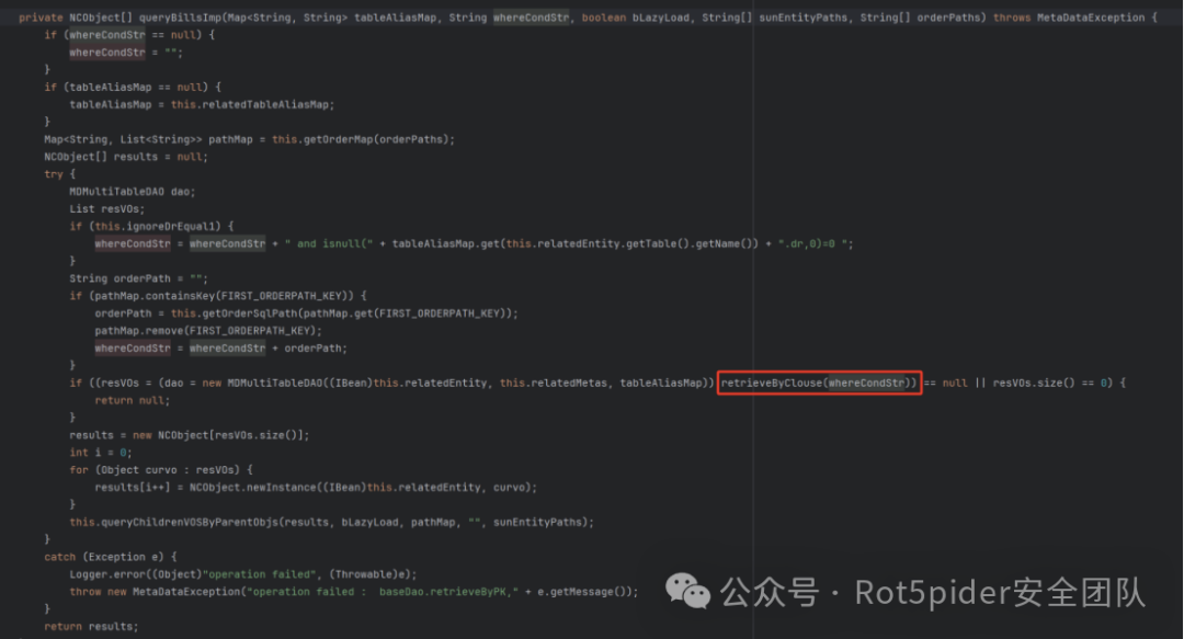 跟进queryBillsImp方法,可以看到将whereCondStr参数拼接到SQL语句中,后续new一个MDMultiTableDAO 对象调用retrieveByClouse方法,将whereCondStr参数传入该方法