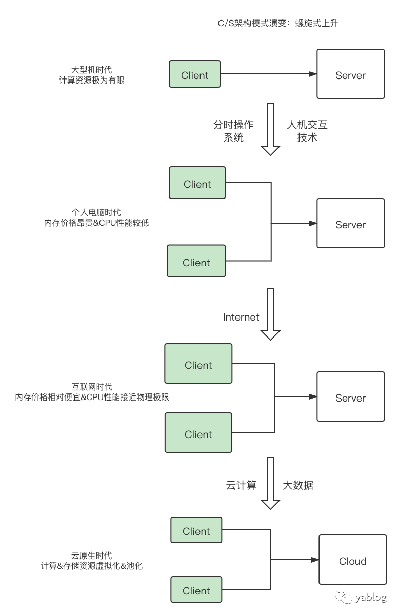 从大型机时代一直到云原生时代,Client(客户端应用程序)从『小』到『大』,再从『胖』到『瘦』,看似稀疏平常的回归,实质是底层的支撑性技术已然发生了翻天覆地的变化:内存价格持续下降、CPU 性能呈指数提升、网络带宽飞速增长...