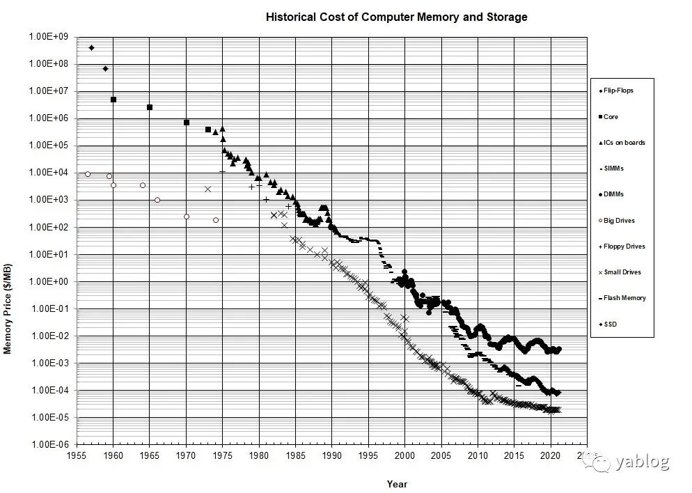 图2 1955-2020 内存价格变化历史 - https://jcmit.net/