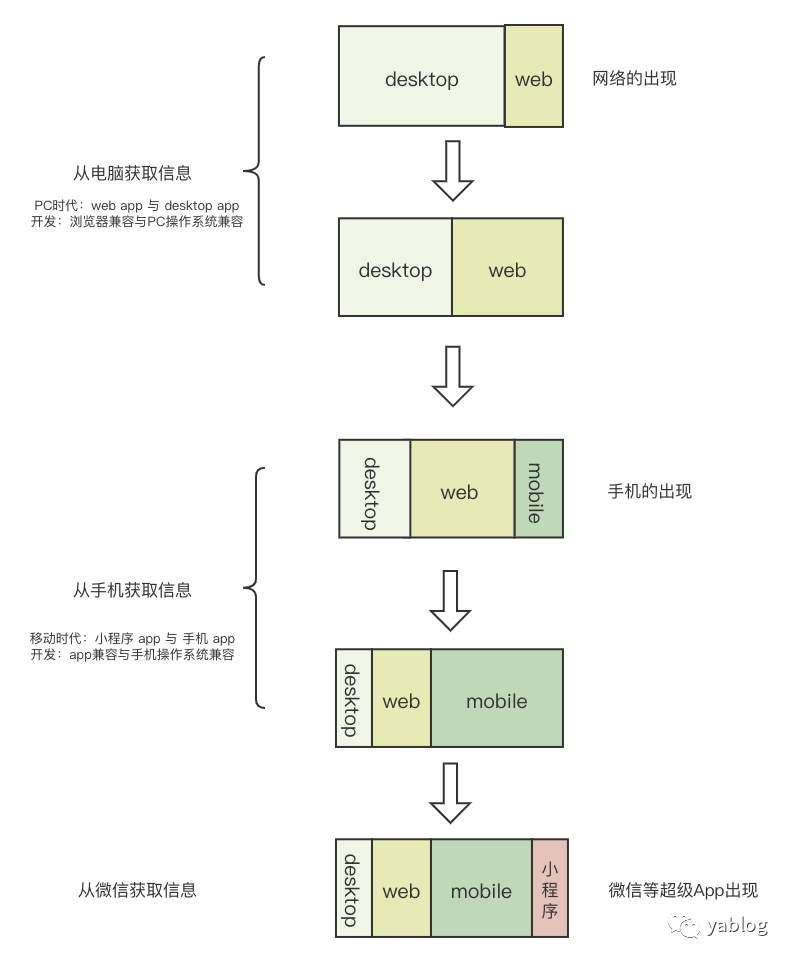随着『发布』信息的设备不断演化与变迁,应用软件从最初的桌面软件形式,逐渐发展为桌面软件、Web 应用程序、移动应用程序三足鼎立的综合格局(小程序可归为移动应用程序之列)。虽然应用程序有此三大表现形式,但其所占比例却大为不同: