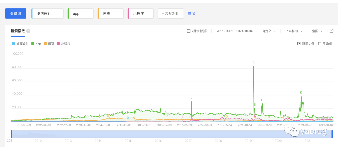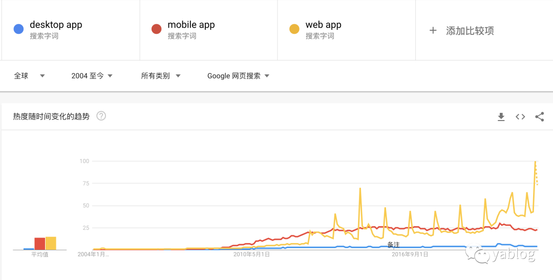 注:国内与全球趋势有细微差别((移动) App 与 Web App 份额均远大于桌面软件,但国内移动 App热度热度明显高于 Web App),同时为避免关键字带来的误差,笔者在通过微信指数查询结果与百度指数类似,在此就不列出了,读者可自行验证。