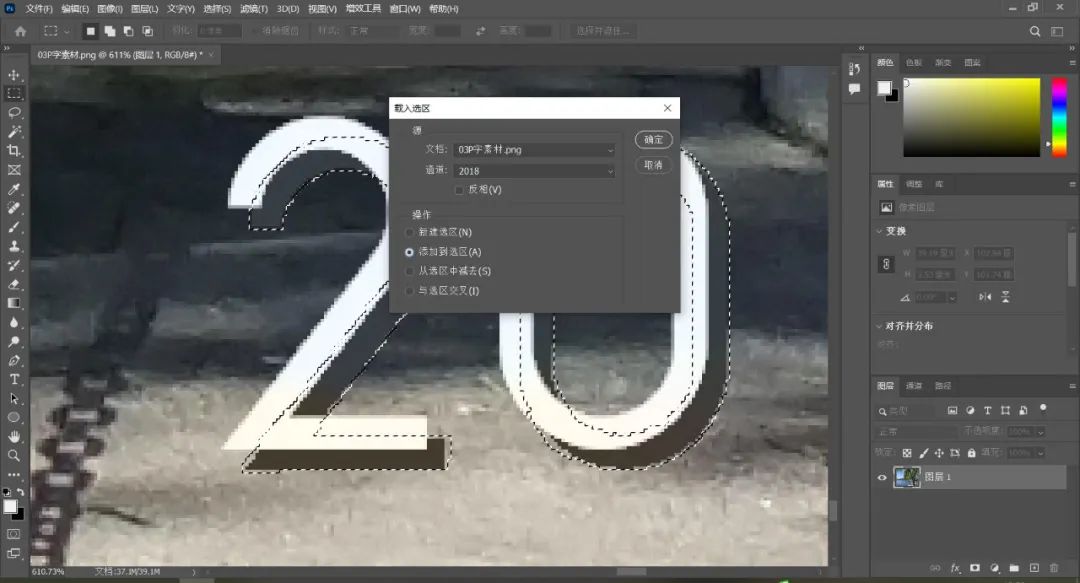 5.打开选择-载入选区,通道选择刚才保存的“2018选区”,操作选择“添加到选区”,然后确定。