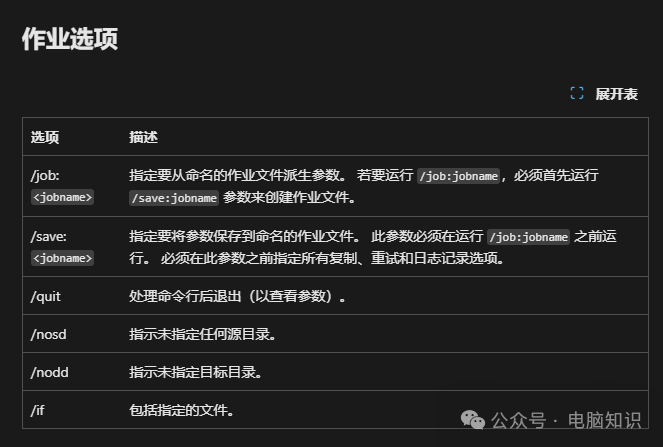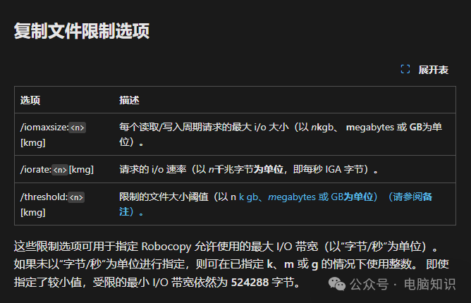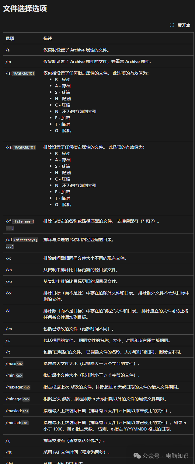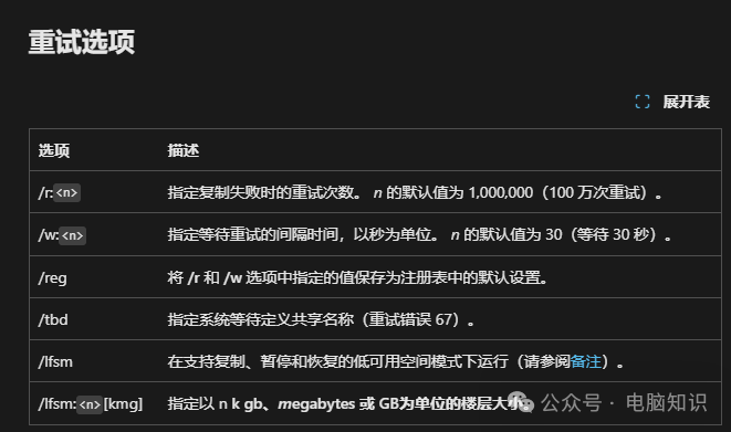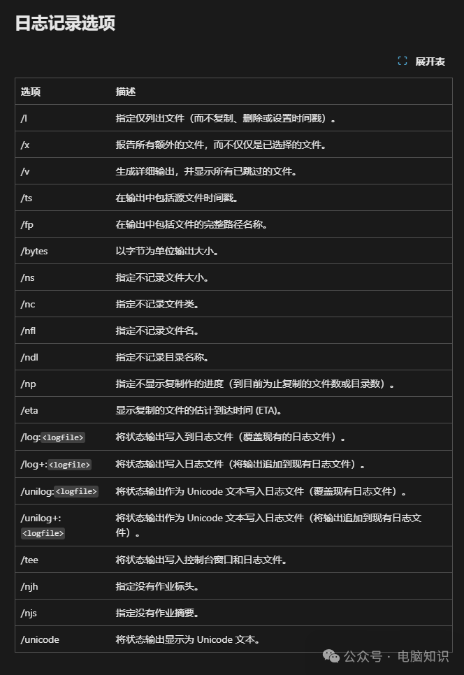 关键要素说明: 源路径:支持本地路径(C:\Data)或网络路径(\\Server\Share) 目标路径:必须已存在,否则会报错 [文件]:指定要复制的一个或多个文件。 支持通配符(* 或 ?)。 如果未指定此参数,*.* 将用作默认值。 [参数]:指定要与 robocopy 命令结合使用的选项,包括复制、文件、重试、日志记录和作业选项。核心功能开关,下文详解。 三、常用参数速查表