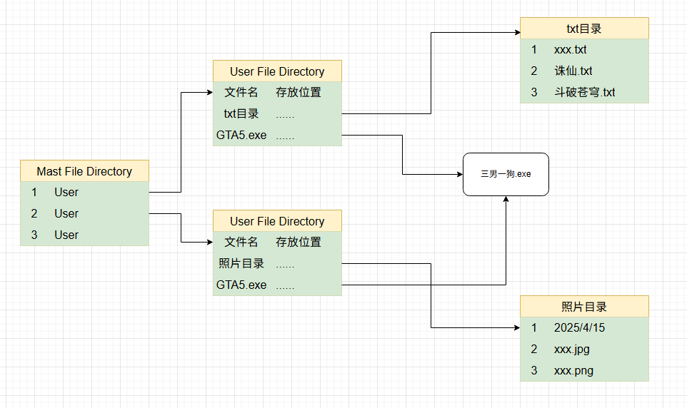 两级目录允许不同用户的文件重名,但依旧缺乏灵活性。因为不能对自己的文件进行分类
