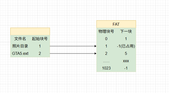 原理:将所以块的链接指针集中存储在一张文件分配表中(File Allocation Tab,FAT)中,磁盘的每个块对应一个item,并记录它的下一个块号。