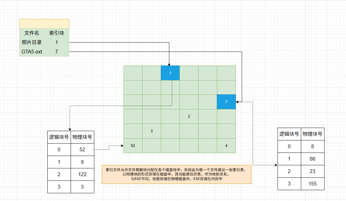 原理:索引块是一个物理块,其中每个表项对应一个数据块的物理地址。文件的逻辑块号对应索引块中的表项索引。