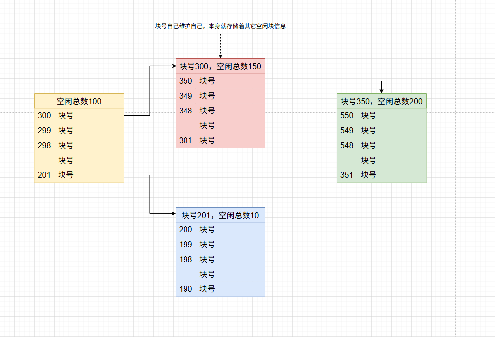 原理:将空闲块分组,每组记录下一组的快号,最后一组指向NULL或-1。