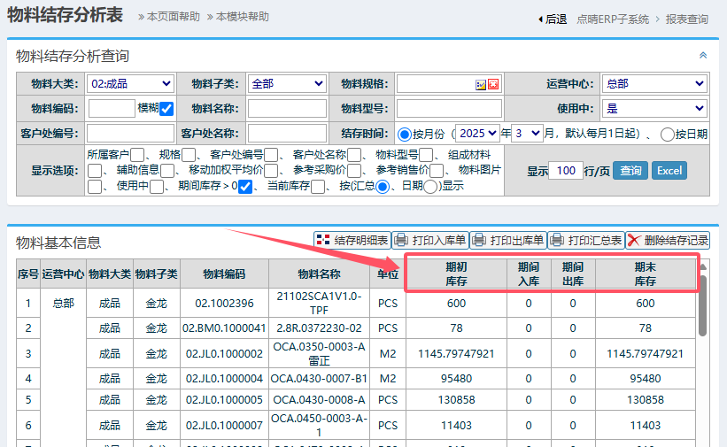 [点晴模切ERP]如何查看全厂各个仓库中物料的库存期初期末情况?
