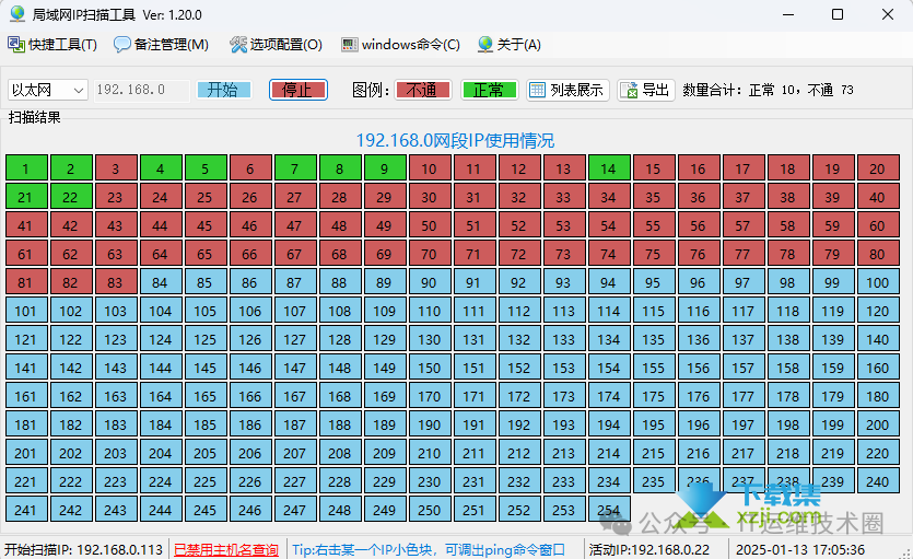 工具介绍是一个局域网内快速搜索IP是否在线的小工具,并集成了多个网络调试工具,包括IP段扫描、端口扫描、windows命令、IP地址计算器、系统端口占用查看工具等。 智能网络探测系统采用ICMP/TCP双协议检测机制,实现网络节点状态智能判别。支持自定义可视化状态标识,提供完整的终端信息检索功能(IP地址、主机名、物理地址),集成快速诊断命令入口。 多网卡IP配置管理支持多网络适配器的独立配置与混合管理模式,具备IP参数历史记录库,提供快速切换方案。包含批量操作接口与配置模板功能,适配复杂网络环境需求。 网络拓扑扫描引擎提供三种扫描模式:
