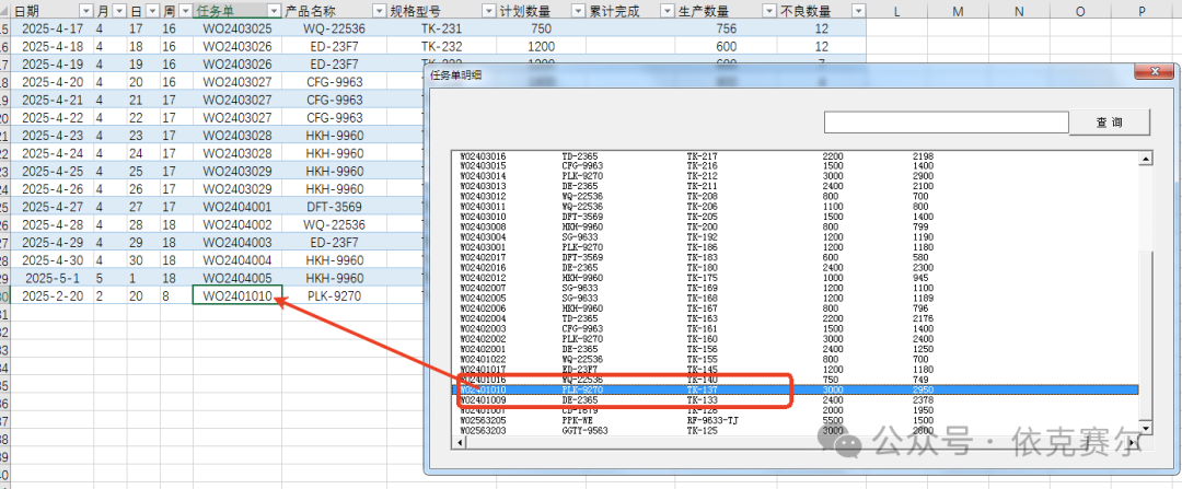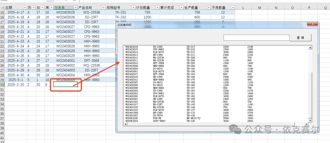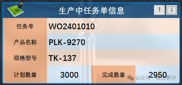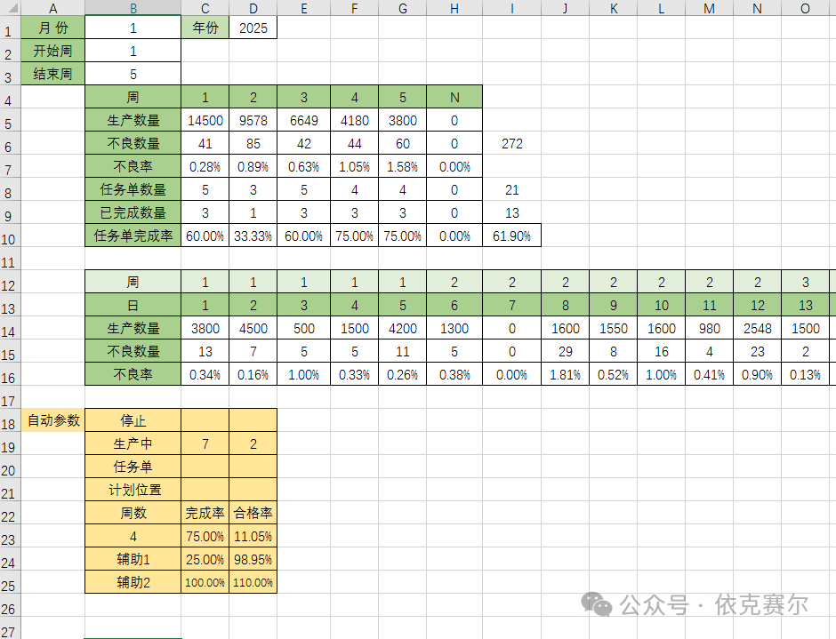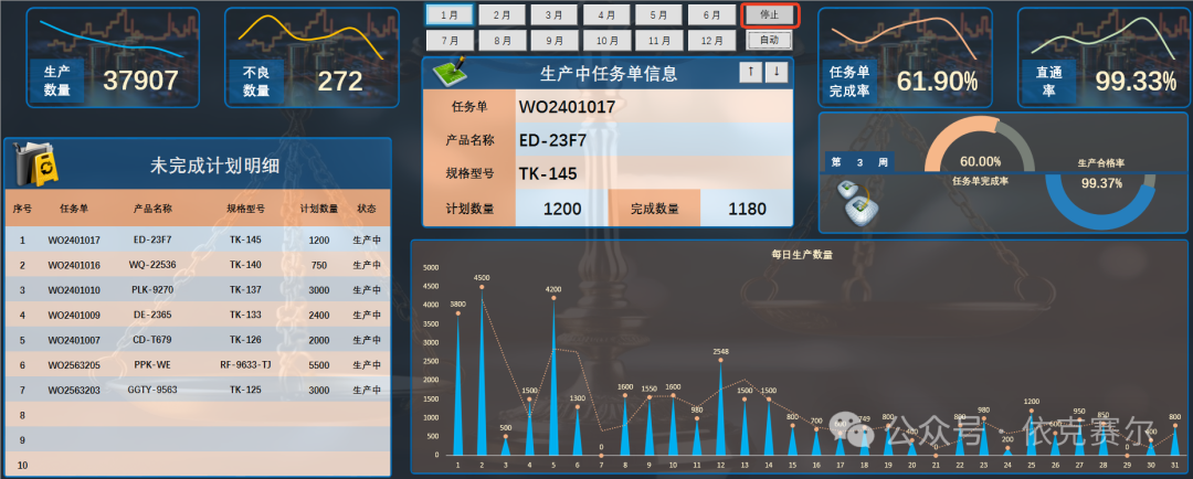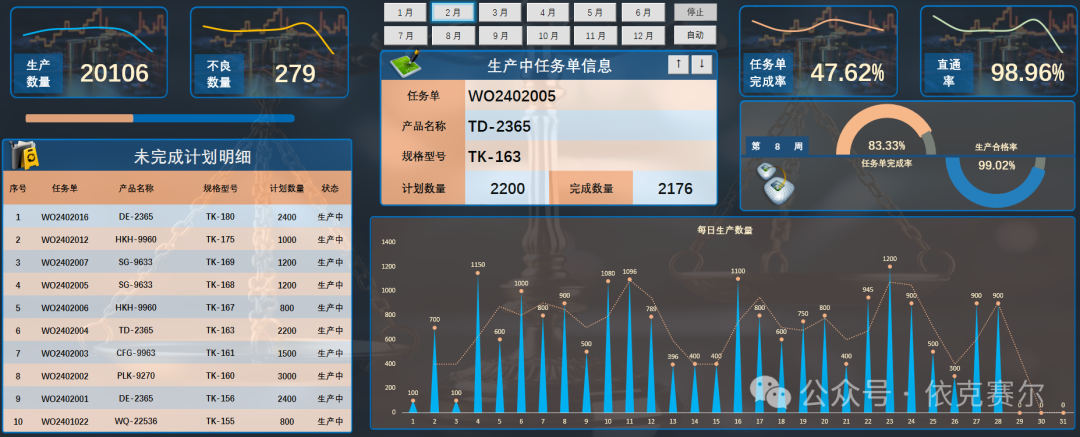 生产数据可视化看板 生产数据可视化看板3.5:生产数据可视化看板是一种直观、高效的工具,旨在帮助企业实时监控和分析生产过程中的关键数据。通过将复杂的生产数据转化为图表、动态图形,管理者能够快速掌握生产线的运行状态、设备效率、产品质量以及资源消耗等核心指标。看板支持多维度数据分析,帮助识别生产瓶颈、优化资源配置、提升生产效率,并支持决策制定。无论是实时监控还是历史数据回溯,生产数据可视化看板都能为企业提供清晰、 actionable 的洞察,助力实现智能制造和精益生产的目标。本期分享的生产数据可视化看板主要用于生产数据的实施更新和展示,并能实现一键循环展示生产任务状态以及相关的生产数据等信息。 1、月份切换:数据看板可通过月份按钮切换,切换后可查看对应月份的数据。月份切换后看板对应的统计数据自动切换到对应月份。 2. 数据统计:看板看板顶端四个矩形框统计当月对应的数据信息,其中矩形框的折线图表示当月对应每周的数据趋势信息。 2.1 生产中任务单信息:看板中心位置显示生产中的任务单信息,可通过右上方的向上和向下按钮切换查看。当前信息支持自动循环播放。 2.2 未完成计划明细:未完成计划明细显示当月所有为完成状态的任务单信息,当前信息也可一键循环播放查看。 2.3 生产数量统计:图表右下方通过柱状图的形式统计当月每日生产数量。 2.4 环形图:图表右侧通过两个环形图统计当月每周的任务单完成率和生产合格率,且周数可根据需要自动循环切换。 3 自动循环: 点击月份按钮右方的自动按钮,状态切换为“自动”看板信息可自动循环显示当月的数据,数据按指定的时间循环切换。如不需要自动切换,点击“停止”按钮即可,状态自动切换为停止。 3.1循环进度:以进度条的形式显示循环的进度。 4、任务单:新增任务单,只需要在任务单的工作表输入对应的任务单信息即可。任务单信息只需要输入日期、任务单、产品名称、规格型号和计划数量和状态即可,其他信息均可通过公式自动获取 5 生产记录:生产数据更新,在生产记录的工作表录入对应信息即可。 5.1 日期录入:在日期列双击空白工作表,可打开日期选择窗口,实现日期的快速录入。 5.2任务单信息:在任务单列双击空白单元格,可打开任务单信息选择窗口,双击需要录入放入的任务单信息后,自动添加到任务单信息录入位置。只需要输入生产数量和不良数量即可更新图表。 6、数据统计:数据统计工作表的公式如无必要切勿修改。