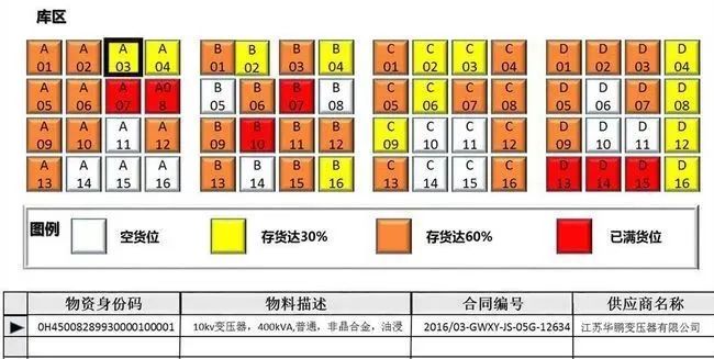 在系统中建立货位映射关系是可视化的基础。即系统按照货位划分实时统计存放货物数量,并根据每个货位的存储量,将数据库中各货位货物存储数据文件以不同颜色映射在每个货位上,使仓库中的各货位使用情况显示更加直观、形象。另外,如果需要某个货区更加详细的信息,可以直接点击此货区进入查询,同样以可视化的方式显示货区内部各货位的情况,甚至可以详细到每个货物,实现了库存信息的可视化及系统的可视化操作。