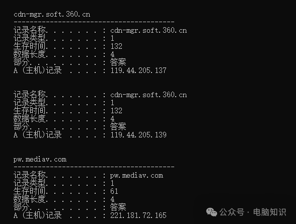命令进行查看电脑缓存的DNS记录,查询结果如下图所示
