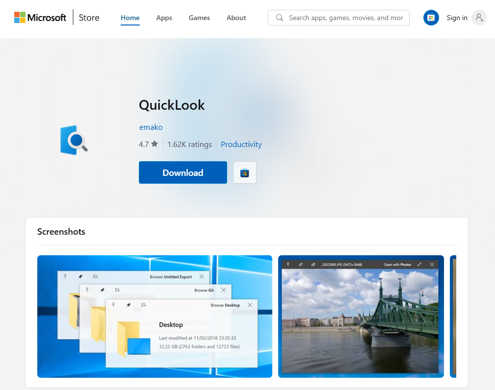 QuickLook 目前已在微软商店上架,可以一键安装,或者从 GitHub下载安装包。