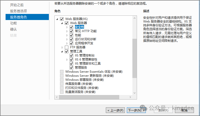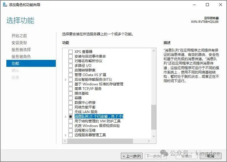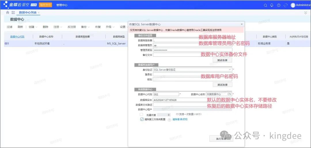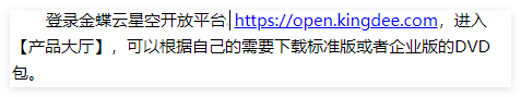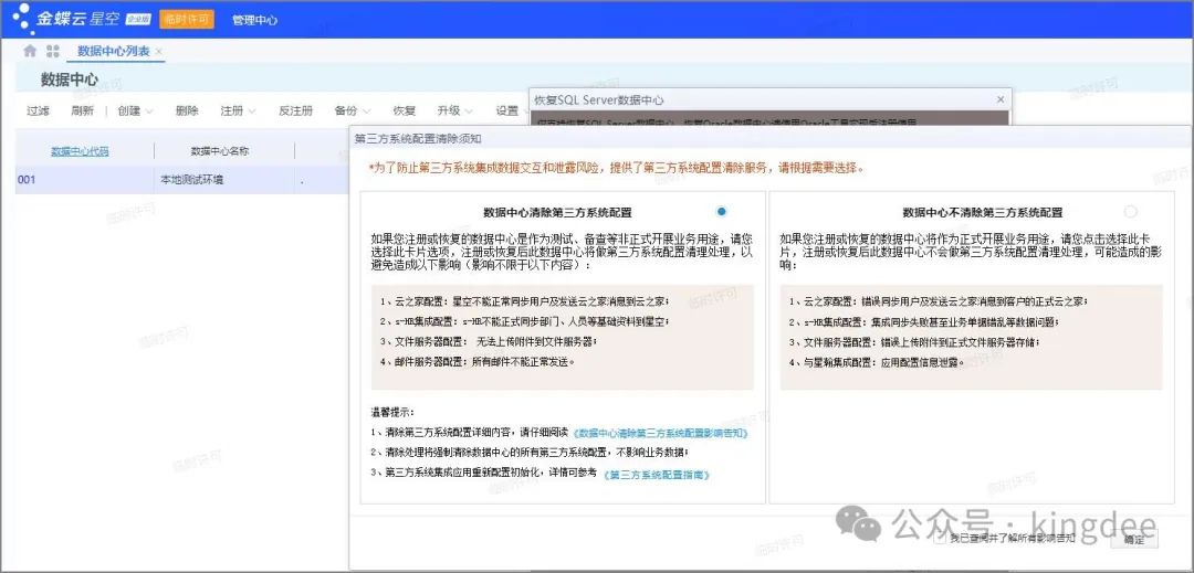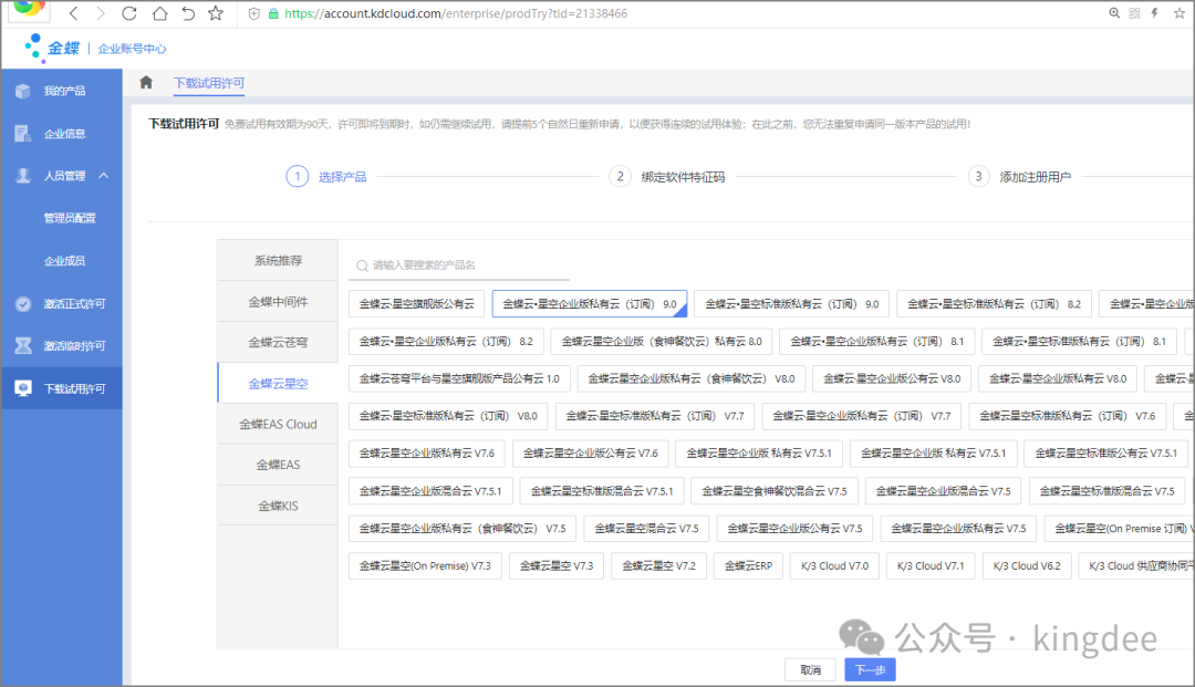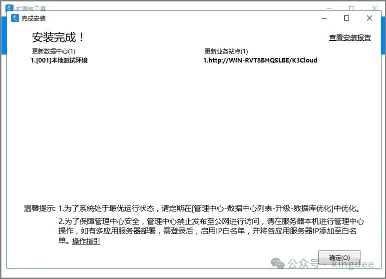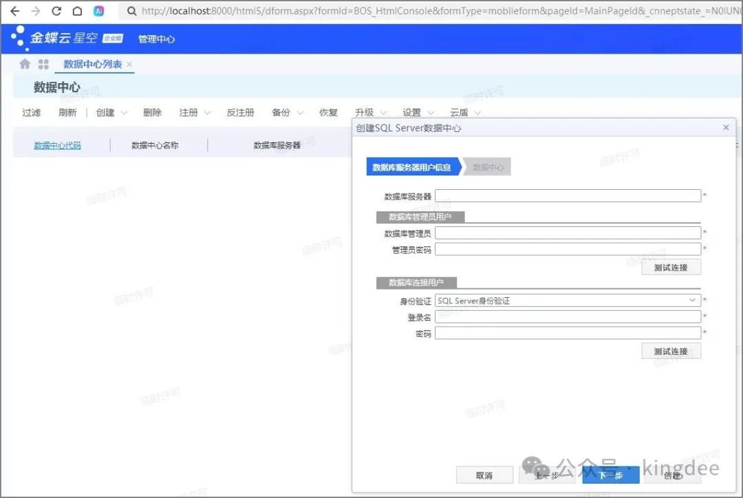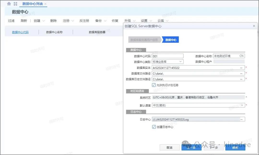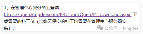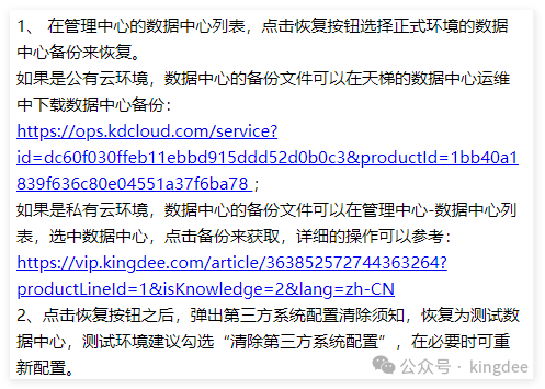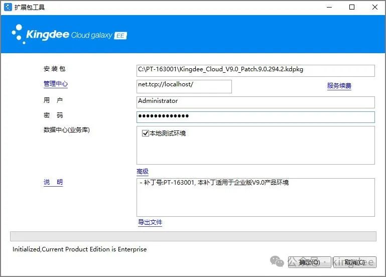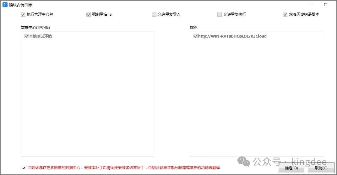 本文以安装金蝶云星空V9企业版,并升级9.0.0.20241121版本为例,描述整个金蝶云星空测试环境的搭建过程,方便客户更加快速准确的搭建测试环境。 主要应用场景为: 1、 金蝶云星空公有云环境搭建线下测试环境; 2、 补丁升级前,先搭建金蝶云星空测试环境测试升级; 3、 开发、对接等测试需求下的金蝶云星空测试环境搭建。 2.金蝶云星空测试环境搭建过程2.1 下载金蝶云星空V9安装包1、 DVD包下载路径 点击产品介绍说明,进入产品详细介绍页面,点击【下载安装包】进行安装包下载。 2.2金蝶云星空安装部署环境要求本文以硬件环境6C,32G,1TSSD,系统环境为windows server2016,sql server2012为例编写(操作系统和数据库安装不在本文档描述范围,需要IT工程师先行部署)。硬件的推荐配置可以参考金蝶云星空DVD安装包下,help文件夹中的产品安装指南,获取当前版本支持的操作系统和数据库版本信息。 2.3金蝶云星空安装部署环境准备1、服务器管理器中安装IIS 和 .net4.8(V9版本之前.net4.5即可)、消息队列。 1. IIS中除了FTP服务器之外,其他的功能建议都展开勾选安装。 2. 自带的.net4.x版本全部勾选安装。 3. 在下方勾选消息队列安装。 4. 在安装包中找到安装包K3Cloud_DVD_9.0_ENT\OS_Default\vcredist_x64安装vc_redist.x64.exe(如果操作系统自身不带.net4.8,还需要在安装包K3Cloud_DVD_9.0_ENT\OS_Default\DOTNETFX48中找到ndp48-x86-x64-allos-enu.exe进行安装)。 2.4金蝶云星空产品安装1、运行setup.exe安装程序,进入到安装欢迎界面,点击“开始”,进入下一步安装步骤。 2、录入公司名称,选择安装位置(可以自定义路径,不要安装在中文路径下)。 3、下一步之后,会进行环境检测,因为在之前已经安装好必要的环境依赖,所以检测基本可以通过,下图中的2个可以忽略(安全软件最好在安装过程中退出,可能出现误拦截的情况)。 4、点击下一步,正式开始安装。 5、安装完成。 6、创建管理中心。 数据库服务器:数据库服务器的ip或者机器名。 数据库管理员用户:能连接数据库服务器的管理账号和密码,一般为sa。 数据库连接用户:能连接数据库服务器的一般账号和密码,可以同数据库管理员用户。 数据库实体:系统自动生成,该实体为管理数据库的数据库实体。 数据库文件路径:数据库实体存放的本地路径,点击搜索按钮会弹出数据库服务器的文件路径,根据自己的需要进行设置。 数据库日志文件路径:日志库存放的路径,默认设置成和数据库文件路径相同。 7、登录管理中心并创建数据中心。 管理库创建完成后,登录管理中心,管理中心登录账号密码默认为:Administrator\888888。 进入【数据中心列表】可进行业务数据中心创建和维护(创建、删除、注册、反注册、备份、恢复等)。 输入数据库服务器ip或者机器名,数据库管理员账号,数据库连接用户(可以同管理数据中心创建),下一步输入数据中心名称,选择数据库实体存放路径,进行业务数据中心的创建。 2.5更新标准产品补丁2、补丁安装依赖K3cloudManager服务(环境安装完成后,该服务会自动生成),检查服务器是否正常启动。 3、 在管理中心服务器打开补丁包安装文件。 4、 输入管理中心登录密码,点击确定。 5、 在弹出的确认安装框再次点击确定开始安装,等待安装完成(补丁安装过程,用户无法正常使用星空系统)。 到这里,星空标准功能已经安装完成并升级到了目前最新的9.0.0.20241121版本。 如果有二开功能部署,建议咨询二开工程师,是否部署补丁或者直接拷贝对应的二开dll文件到website\bin目录。 3. 恢复数据中心备份3、如何恢复数据中心的截图如下: 等待恢复完成之后,登陆客户端或者浏览器选择对应的数据中心访问。 4 申请临时许可并引入在云平台申请临时许可,但仅限3个用户,单次申请有效期3个月,申请时企业需要是已认证状态。 超过3哥用户的临时许可申请,请联系当地金蝶工程师协助。 获取3个用户的临时许可申请如下步骤: 2、 点【下载试用许可】。 3、 选择和安装产品符合的许可(不能选择公有云)。 4、 输入软件特征码。特征码可以从管理中心的软件许可引入获取,如下图所示: 5、下一步就到注册用户列表界面了,如果软件里面已经有用户了,可以不用录入用户,直接下一步生成许可导入管理中心,重启IIS,再到查询用户列表,勾选用户同步就可以了。 如果软件里面没有用户或服务器不能联网无法同步用户,可以在此新增用户,再下一步生成许可导入管理中心。 6、下载许可时,会提示产品未激活,选择忽略直接下载。 7、下载许可在管理中心导入,导入成功后重启IIS。