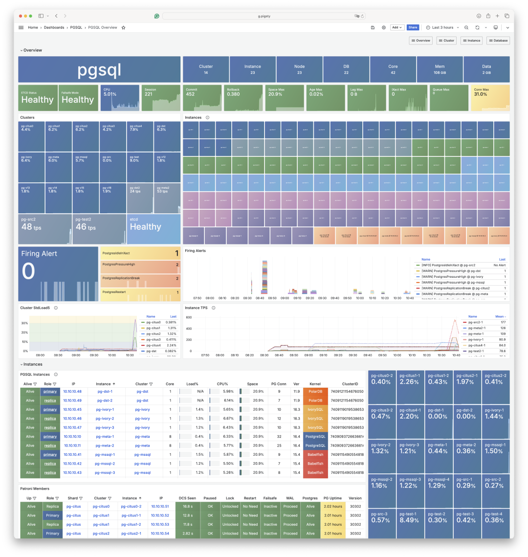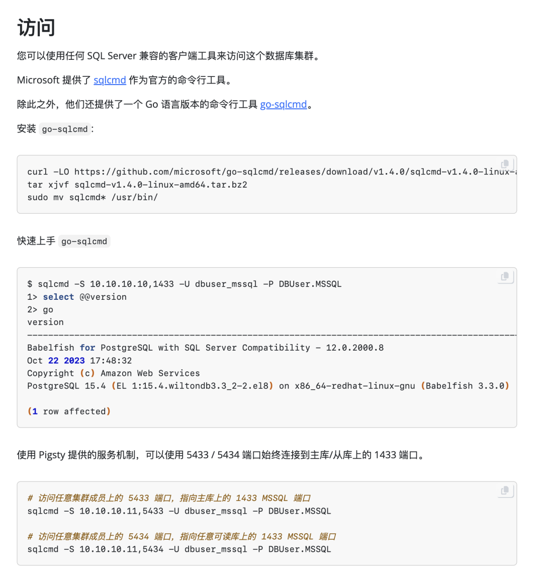 所谓线缆协议兼容,就是指客户端什么都不用改,依然访问 SQL Server 1433 端口,使用 MSSQL 的驱动与命令行工具(sqlcmd)访问加装 BabelfishPG 的集群就可以了。而且更神奇的是,你依然可以使用 PostgreSQL 的协议语言语法,从原来的 5432 端口访问,和 SQL Server 的客户端并存 —— 这就给迁移带来了极大的便利条件。 WiltonDB当然 Babelfish 并不是一个单纯的 PG 扩展插件,它对 PostgreSQL 内核进行了少量修改与适配。并通过四个扩展插件分别提供了 TSQL 语法支持,TDS 线缆协议支持,数据类型以及其他函数支持。 在不同的平台上编译打包这样的内核与扩展并不是轻松容易的一件事,因此 WiltonDB —— 一个 Babelfish 的发行版就做了这件事,将 BabelfishPG 编译打包为 EL 7/8/9 与 Ubuntu 系统,甚至 Windows 下可用的 RPM / DEB / MSI 包。 Pigsty v3 当然,只有 RPM / DEB 包,距离提供生产级的服务还依然差得太远,而在最近发布的 Pigsty v3 中,我们提供了将原生 PostgreSQL 内核替换为 BabelfishPG 的能力。 创建这样一套 MSSQL 集群,所需的不过是在集群定义中修改几个参数。然后依然是一件傻瓜式拉起 —— 类似主从搭建, 扩展安装,参数优化,用户配置,HBA规则设定,甚至是服务流量分发,都会自动根据配置文件一键拉起。 在使用实践上,你完全可以把 Babelfish 集群当作一套普通的 PostgreSQL 集群来使用与管理。唯一的区别就是客户端在使用 5432 PGSQL 协议的基础上,还可以选择是否要使用 1433 端口上的 TSQL 协议支持。 例如,您可以轻松通过配置,将原本固定指向主库连接池 6432 端口的 Primary 服务重定向到 1433 端口,从而实现故障切换下的无缝 TDS / TSQL 流量切换。 这意味着原本属于 PostgreSQL RDS 的能力 —— 高可用,时间点恢复,监控系统,IaC管控,SOP预案,甚至无数的扩展插件都可以嫁接融合到 SQL Server 版本的内核之上。 怎么迁移过去?PostgreSQL 生态除了有Babelfish这样给力的内核与扩展,还有着繁荣的工具生态。如果要想从 SQL Server 或 MySQL 迁移到 PostgreSQL ,我强烈推荐一款杀手级迁移工具:PGLOADER。 这款迁移工具傻瓜化到了离谱的程度,在理想的情况下,你只需要两个数据库的连接串,就可以完成迁移了。对,真的是一行多余的废话都没有。 有了 MSSQL 兼容内核扩展,又有了迁移工具,存量的 SQL Server 搬迁会变的非常容易。 除了 MSSQL,还有……除了 MSSQL,PostgreSQL 生态还有旨在替代 Oracle替代:PolarDB O 与 IvorySQL,旨在替代 MongoDB 的 FerretDB 与 PongoDB。以及三百多个提供各式各样功能的扩展插件。 实际上,几乎整个数据库世界都在受到 PostgreSQL 的冲击 —— 除了那些与 PostgreSQL 错开生态位(SQLite,DuckDB,MinIO),或者干脆就是 PostgreSQL 套壳(Supabase,RDS,Aurora/Polar)的数据库。 我们最近发布的开源 RDS PostgreSQL 方案 —— Pigsty 最近就支持了这些 PG 替换内核,允许用户在一套 PostgreSQL 部署中提供 MSSQL,Oracle,MongoDB,Firebase,MongoDB 的兼容性替代能力。 不过限于篇幅,这里就不多做介绍了。 =》阅读原文 该文章在 2025/4/23 11:11:43 编辑过 |