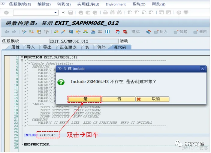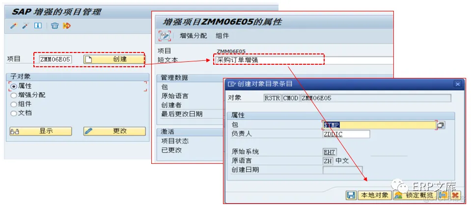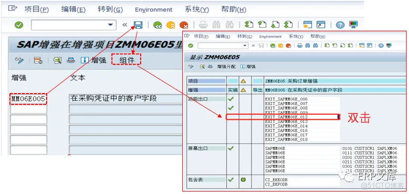 备注:默认带出金额不是收货金额,而是采购订单上的当前净价计算的金额 2.按采购订单收货日期定价 对这采购订单分2批次进行收货,第一次收货,数量250,采购净价15,然后将采购订单净价修改30,第二次收货,数量250,净价30 ,然后做发票校验。 备注:默认带出金额是收货金额,不是采购订单上的当前净价计算的金额。 不同公司财务结算要求不同,在很多项目中财务会要求发票金额必须按收货金额结算,但采购部门定价的业务要求是按凭证日期定价,不能按收货日期定价。 基于以上两点业务要求的情况下,就无法通过配置实现既满足财务又满足采购的业务要求,这时候就需要通过增强来满足这业务需求。 解决上面业务需求的增强实施方案: 针对上面业务需求,下面详细介绍通过实施二代增强方的式来满足这样业务需求的实施步骤。 增强名:MM06E005 出口:EXIT_SAPMM06E_012 具体操作步骤如下 1.创建增强项目(CMOD) 备注:正式系统需要传输的话要选择包,如果自己练习系统可以点本地对象->保存即可 2.分配增强和组件 备注:【实施】栏位上打上勾的表示已做过增强实施的点。 3.写增强代码 在如下按业务要求写上增强代码 具体代码如下: