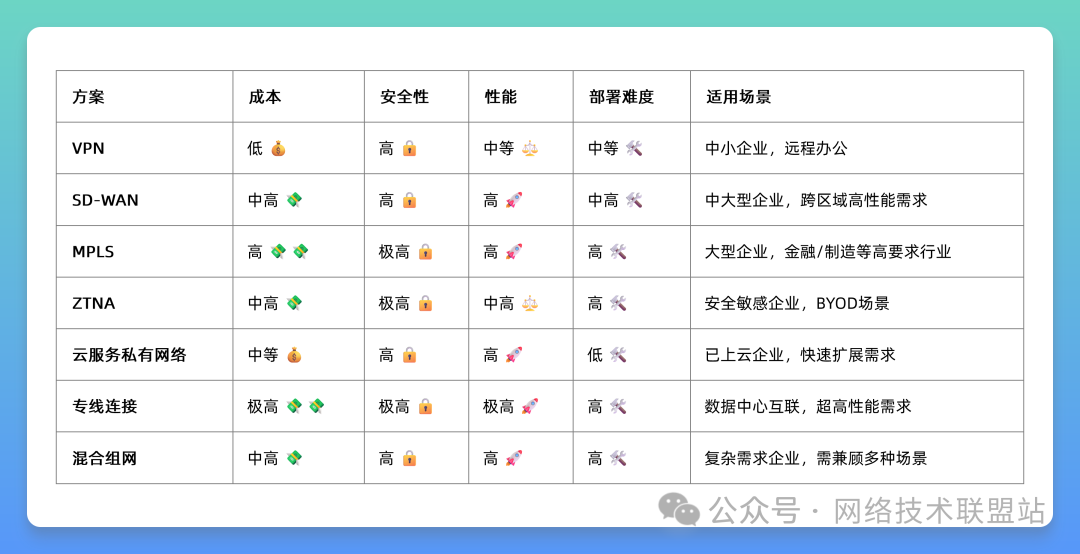 面对这么多选择,你是不是有点眼花缭乱?别慌,选方案的关键在于需求匹配。预算有限?试试VPN。追求性能?SD-WAN或MPLS更合适。安全第一?ZTNA和专线不会让你失望。如果你的企业已经上云,云服务商的方案可能是捷径。而复杂需求下,混合组网或许是最佳答案。
