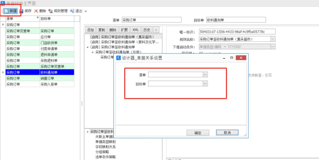 a.源单据与目标单据映射,如源单据《采购订单》,目标单可勾选《应付单》、《付款申请单》、《采购退料单》、《收料通知单》甚至《销售订单》等等;