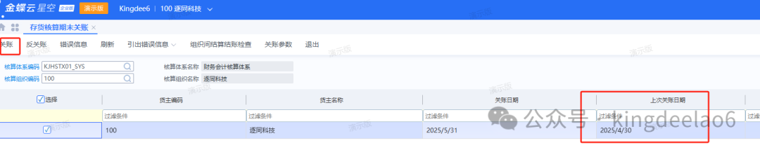 - 库存关账:库存可以在任意时刻进行关账,一般在月底进行关账,关账后所有有关库存的单据不可操作。