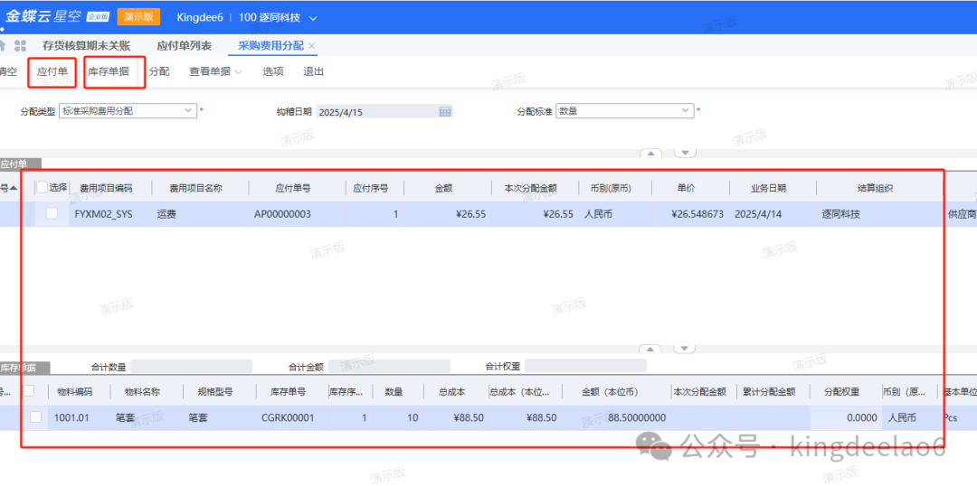 - 出入库单据核算:系统自动进行库存单据的入库出库核算。①这里需要做费用类的应付单,如下图所示,注意需要填写费用项目②选择费用应付单,和相关的库存单据进行相对于的费用分配。