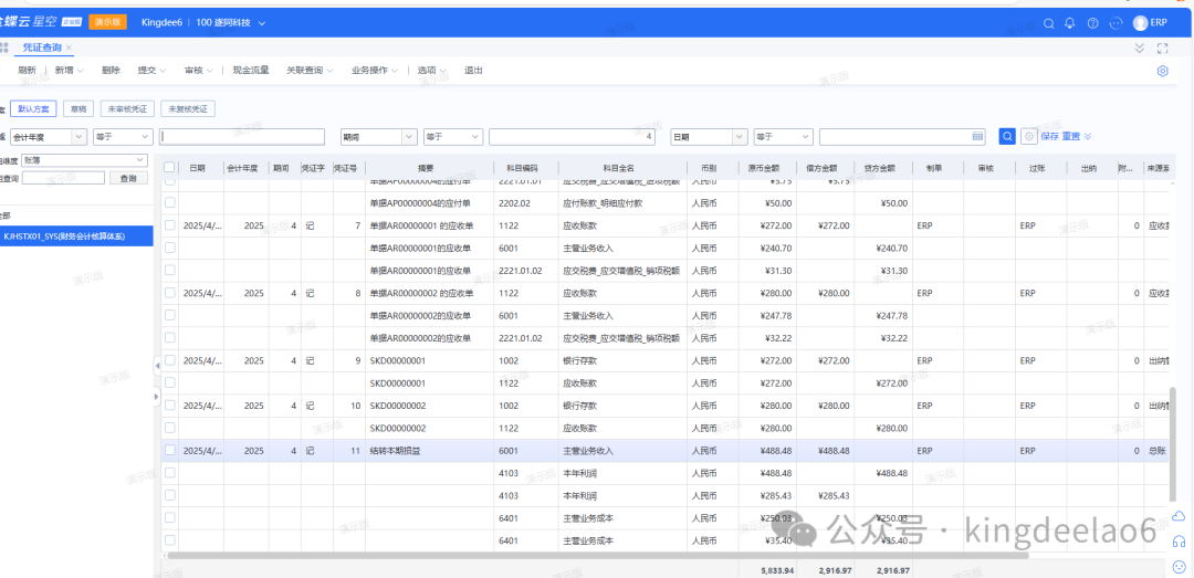 四、看下总账模块最终结完2025年4月第一期的账的凭证情况。需要结转损益进行操作,期末调汇后再进行总账结账,都可以使用向导进行操作。