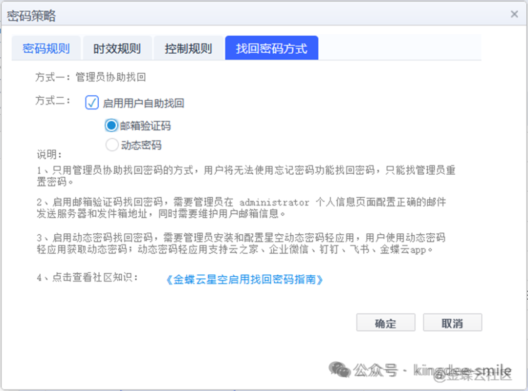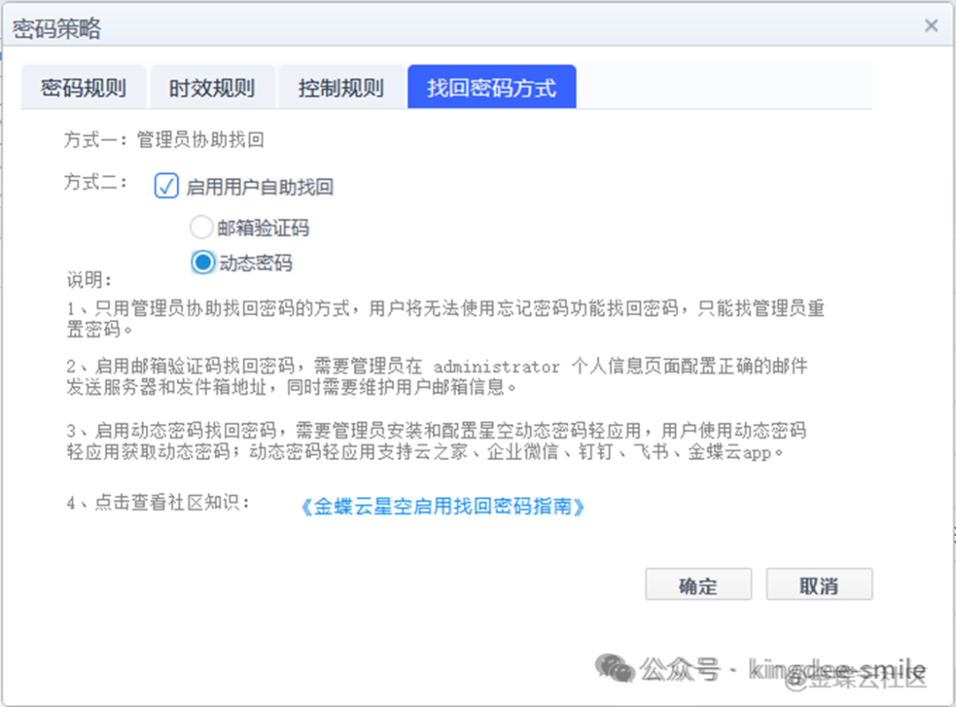 一、【业务场景】 用户长时间未登录系统,忘记了密码,需要通过忘记密码重新设置新的密码。 启用了密码有效期控制,密码到期前或到期后,需要通过忘记密码功能重设新的密码。 用户公司安全管理要求较高,要求用户忘记密码后,不能自主找回,只能找管理员协助重置密码。 支持多种方式为用户找回密码:邮箱验证码、动态密码、管理员重置密码。 二、【知识概览】 (一)系统管理员 1.如何启用邮箱验证码找回密码的方式 启用邮箱验证码找回密码的方式 密码策略中,启用邮箱验证码找回密码的方式 2.如何启用动态密码找回密码的方式 administrator打开查询用户-密码策略,启用找回密码方式如下图: 启用动态密码找回密码的方式后,需要管理员安装和配置动态密码轻应用,用户使用星空动态密码轻应用获动态密码。动态密码轻应用支持云之家、企业微信、钉钉、飞书。 3.管理员协助找回密码的方式 登录界面点击找回密码,提示联系管理员重置密码,无需用户用户操作,管理员重置完密码后告知用户。