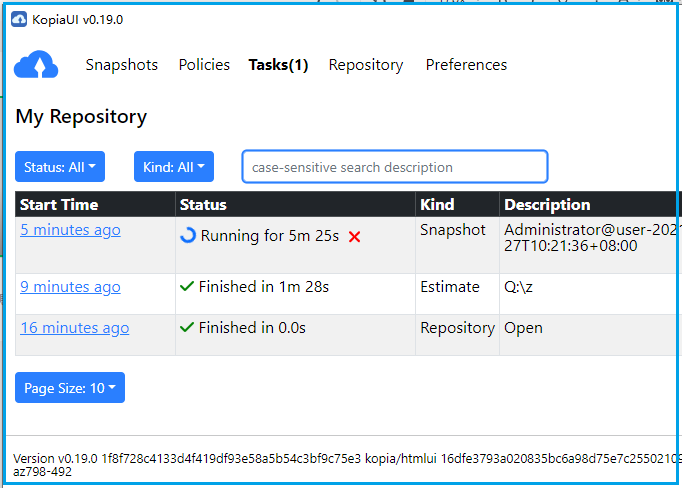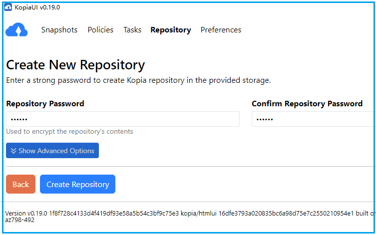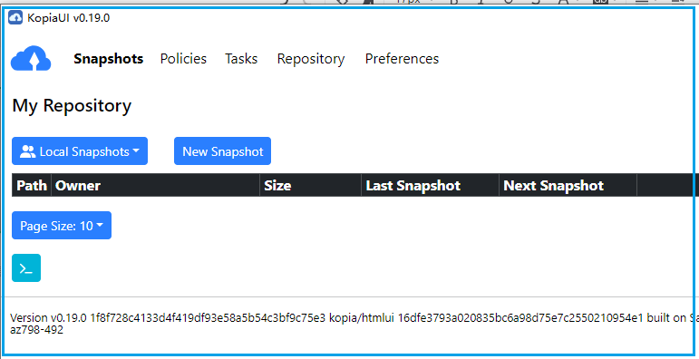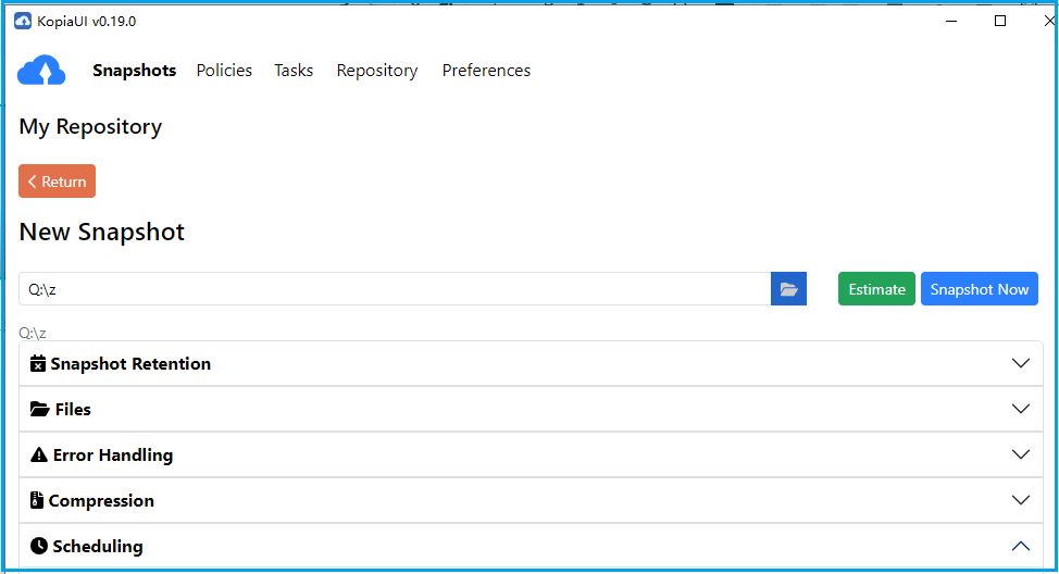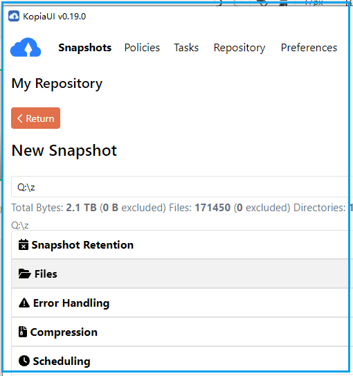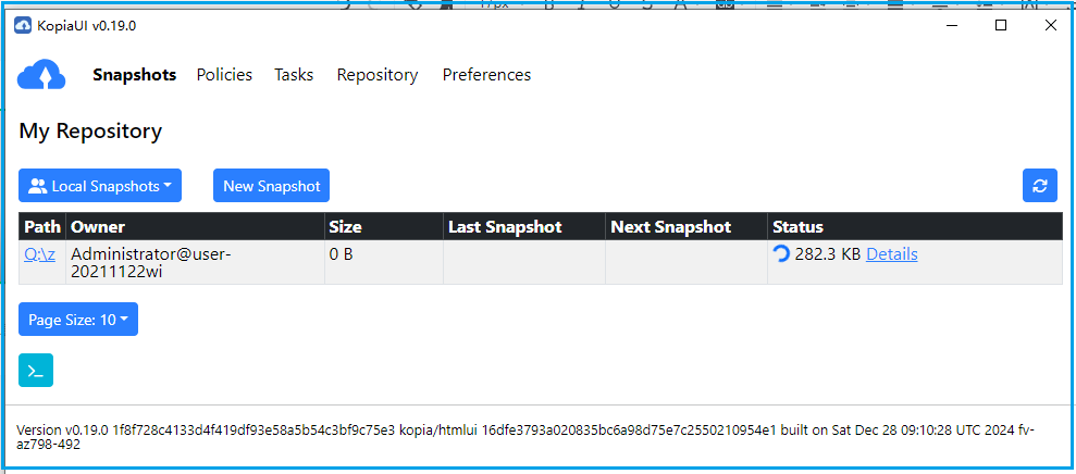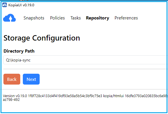 Kopia 采用增量备份技术,仅存储变化的数据块,结合全局去重(deduplication),显著减少存储空间占用。同时 Kopia 支持多种存储后端,可以将数据存储在本地磁盘、网络存储(SFTP、WebDAV)或 NAS 设备上。Kopia 可以创建、浏览、恢复历史备份快照,支持按时间点还原文件或目录,保留策略可自定义(如保留最近 7 天、每月 1 份等)。下面以 Windows 为例,介绍一下它的备份流程。