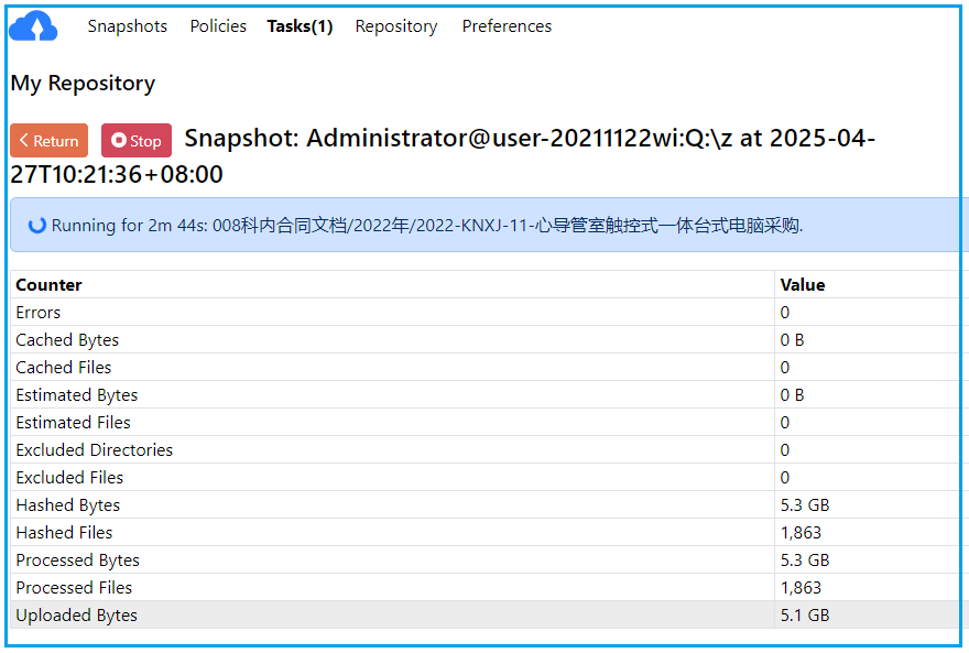 首先在 github 上下载它的对应版本(这里下载的是 windows 版)界面是全英文的,没有中文选项。先选择存储后端,这里选第一个:本地存储。配置备份库的位置(备份库使用的是加密文件,看不到原始文件)。备份库建完了就可以创建快照了(New Snapshot),到这里会让人迷惑,到底对哪里进行备份?在建快照的过程中会让选备份目录(你要备份哪个目录)。在备份前可以评估一下数据量,点 Estmate 开始评估,示例显示数据有 2.1T,171450 个文件。从备份 log 中可以了解到备份任务发起了8个并发。在备份的过程中可以查看 Tasks 标签,里面显示了当前的备份进度,以及当前已经备份到哪里了。回到备份库的库目录,里面是很多看不懂的数据目录,文件是加密存储的。回到 Tasks 标签,可以查看当前任务已经消耗的时间。实际测试过程中有一点搞错了,第一次使用就选了个大目录,应该选个小一点的先测试下功能的。从官方演示视频了解它支持从快照中恢复单个文件或恢复整个目录。同时它也支持命令行,可以将备份任务包装成备份脚本。