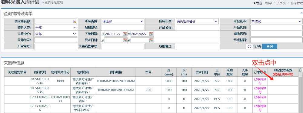 ![]() ![]() 登录成功后,点击进入 如下图: 找到要绑定标签的采购订单明细行,双击点中最后一列 如下图: 填上宽,长,批号,生产日期,片料有多少张,直接填在张数上即可 如下图: ![]() 最后点击绑定按钮 如下图: ![]() 绑定完后,在上方全选,点击打印标签 如下图: ![]() 然后点击打印标签 如下图: 然后点击打印 如下图: ![]() 最后选择打印机,点击确定即可 如下图: ![]() 点晴模切ERP更多信息:http://moqie.clicksun.cn,联系电话:4001861886 该文章在 2025/4/27 14:39:00 编辑过 |
