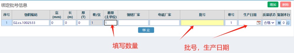 ![]() ![]() 登录成功后,点击进入 如下图: 找到要绑定标签的采购订单明细行,双击点中最后一列 如下图: 直接填上数量,批号,生产日期即可 如下图: